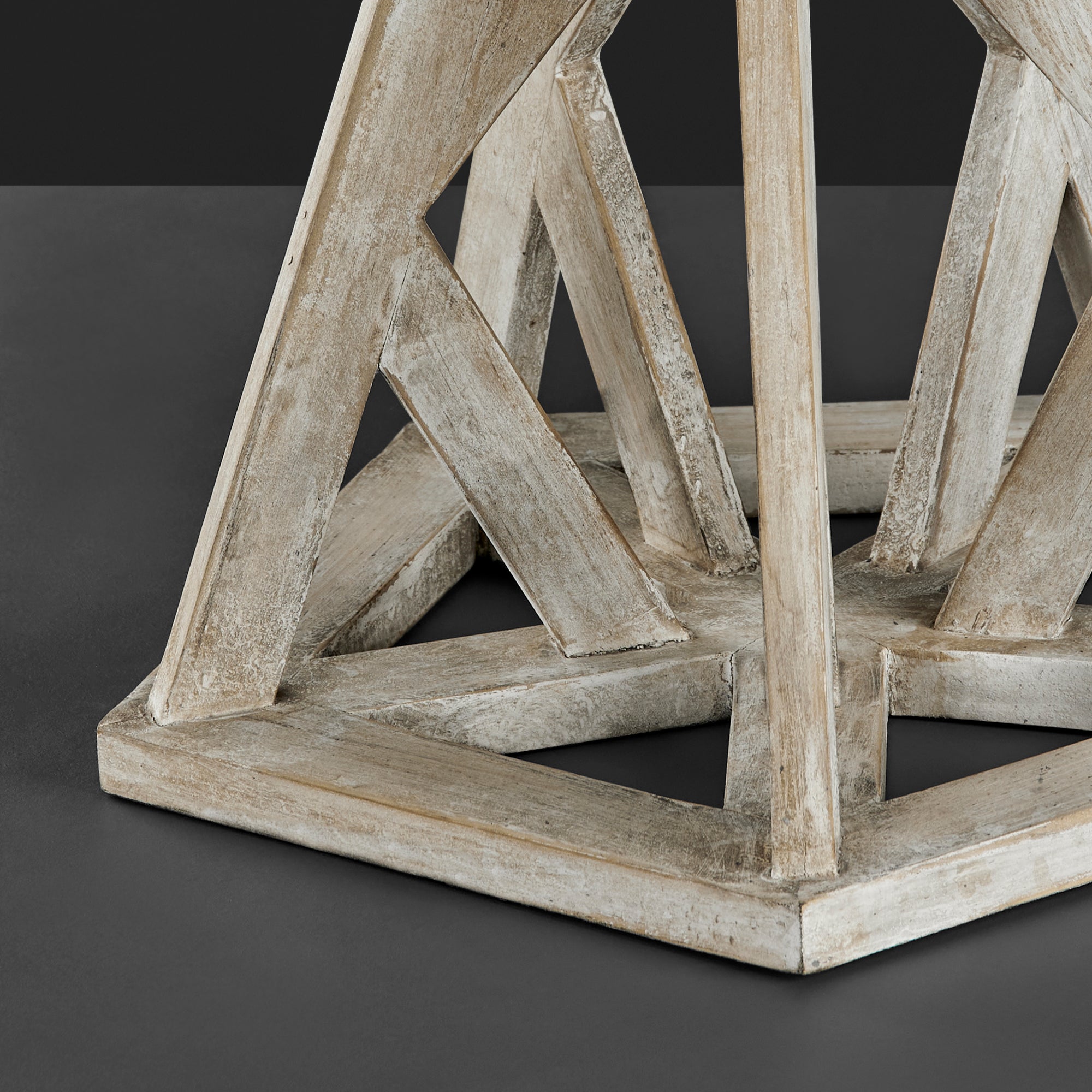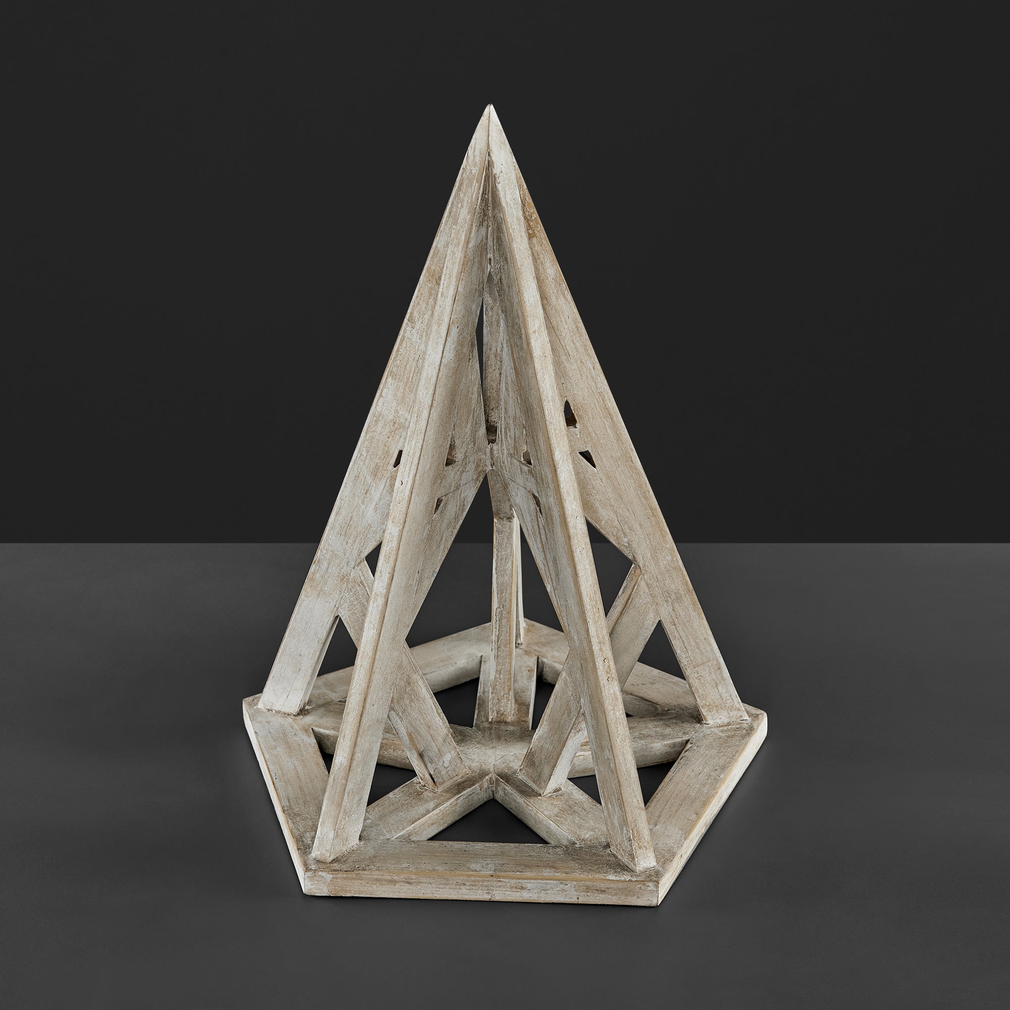 Pieza que refleja el alto nivel de profesionalismo en talla de madera. El Accesorio Velco se conforma por un pentágono como base, que remata en una bella punta geométrica. Su acabado en tonos blancos y grises lo vuelven cálido y atractivo.