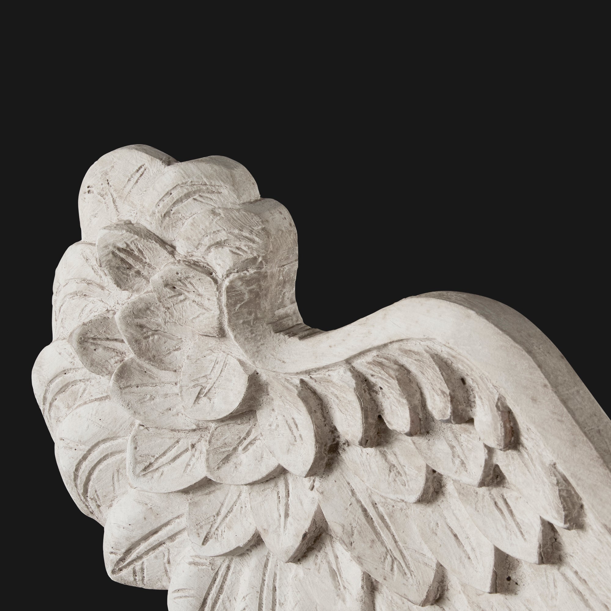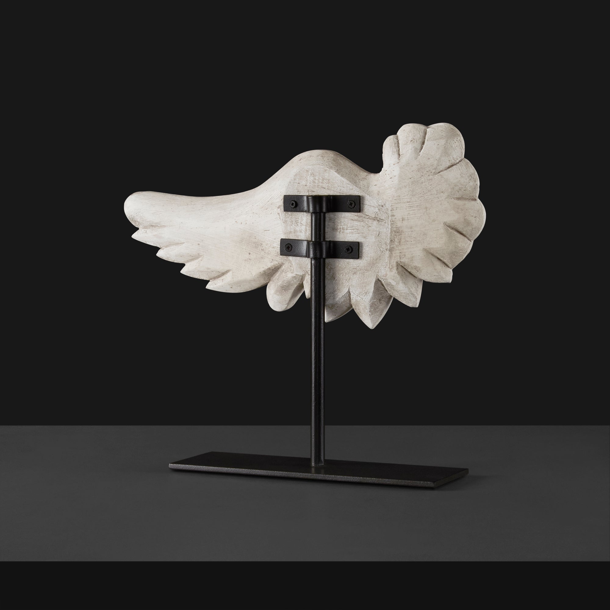 Bella réplica de un ala abierta, manufacturada en madera maciza, entintada en tono blanco con efecto desgastado y con un pedestal de metal como exhibidor, su diseño realista lo hace un artículo único.