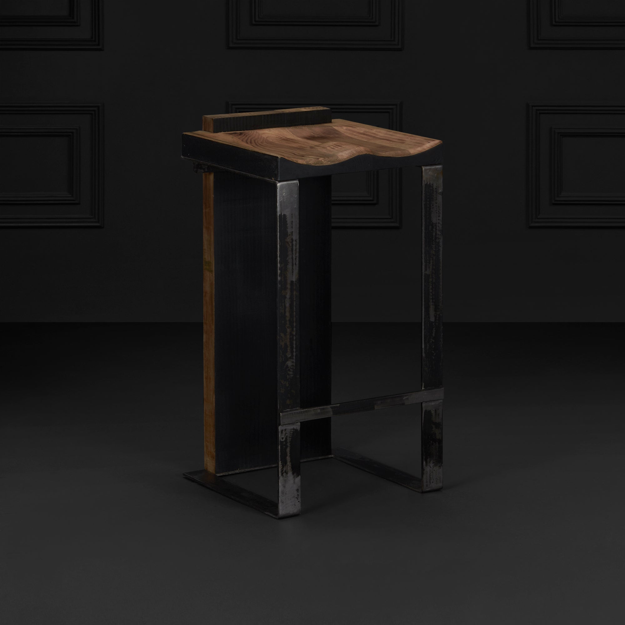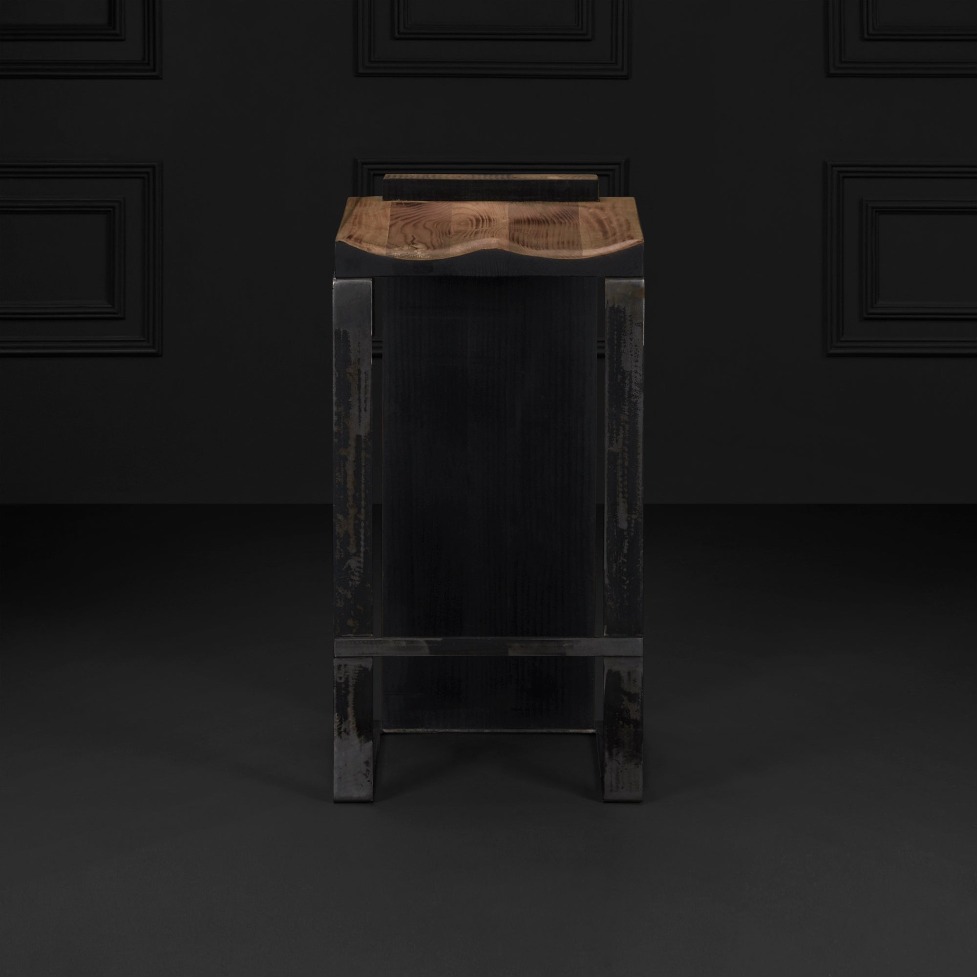 El atractivo diseño del Banco Alto Oscar, ofrece una gran estabilidad, así como comodidad, debido a la talla en el asiento de madera y a su bajo respaldo, pieza elaborada en metal con aplicación de un efecto de desgaste y con un asiento de madera en Acabado Quemado.