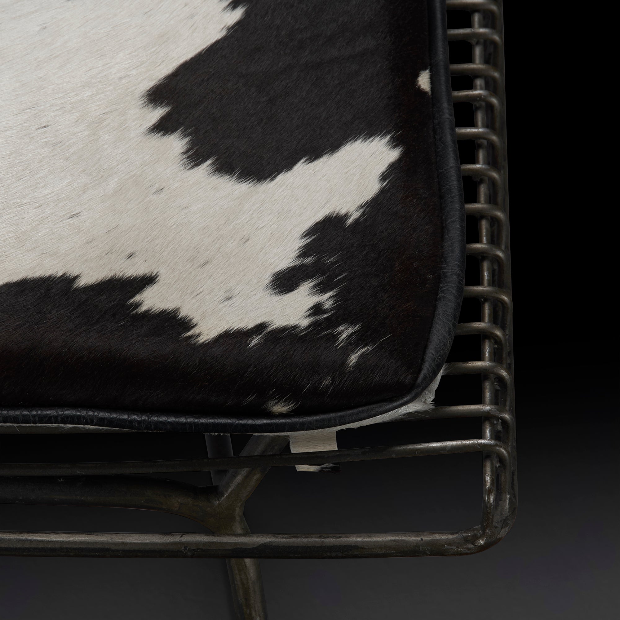 Pieza moderna y atractiva, manufacturada en metal en acabado tinta y laca, con una propuesta de cojín de asiento forrado en piel natural de pelo pinto, el banco castell es sin duda, una alternativa práctica y cómoda para decorar tus espacios.