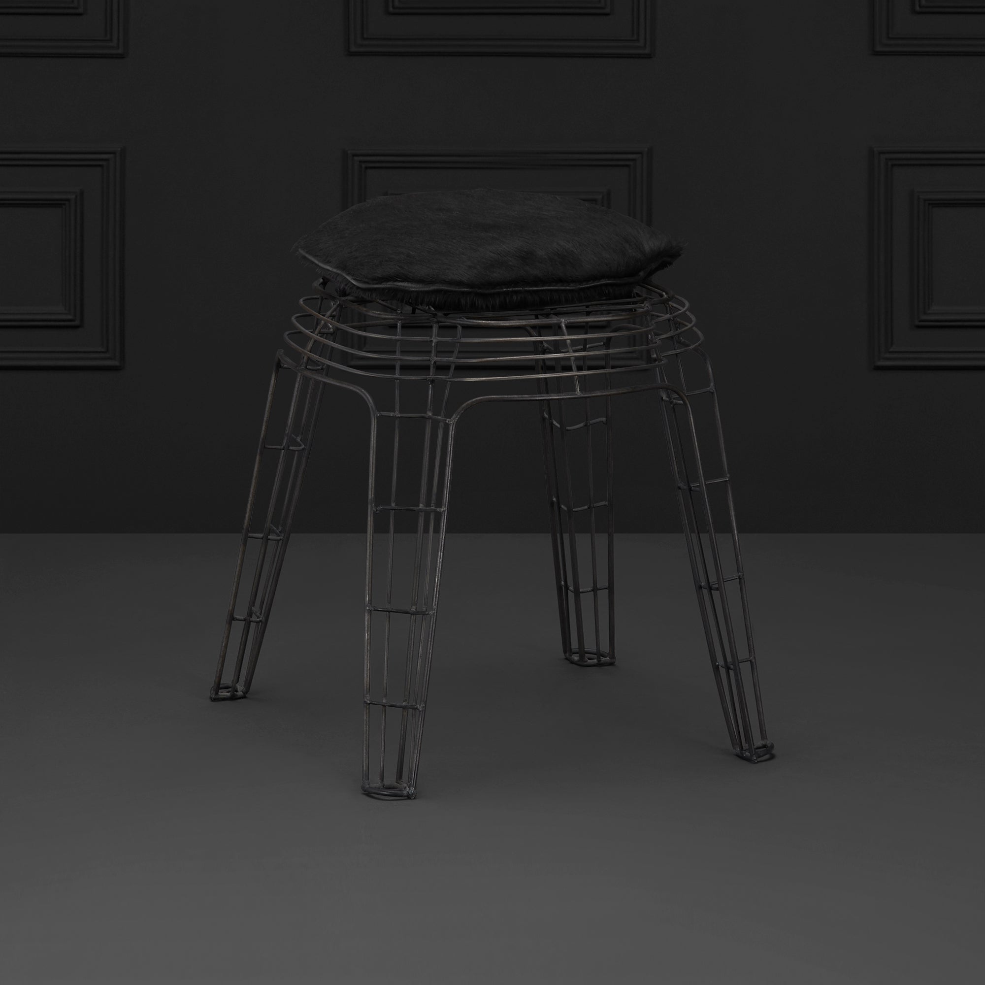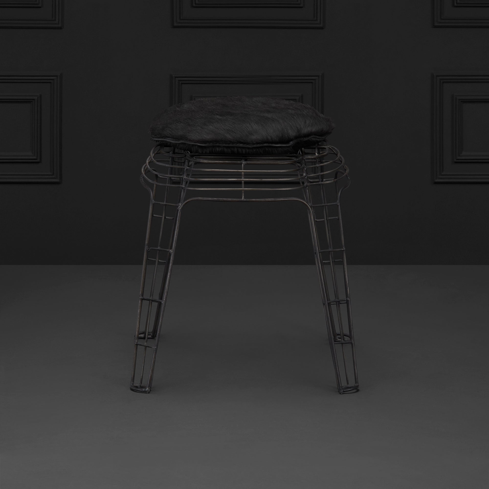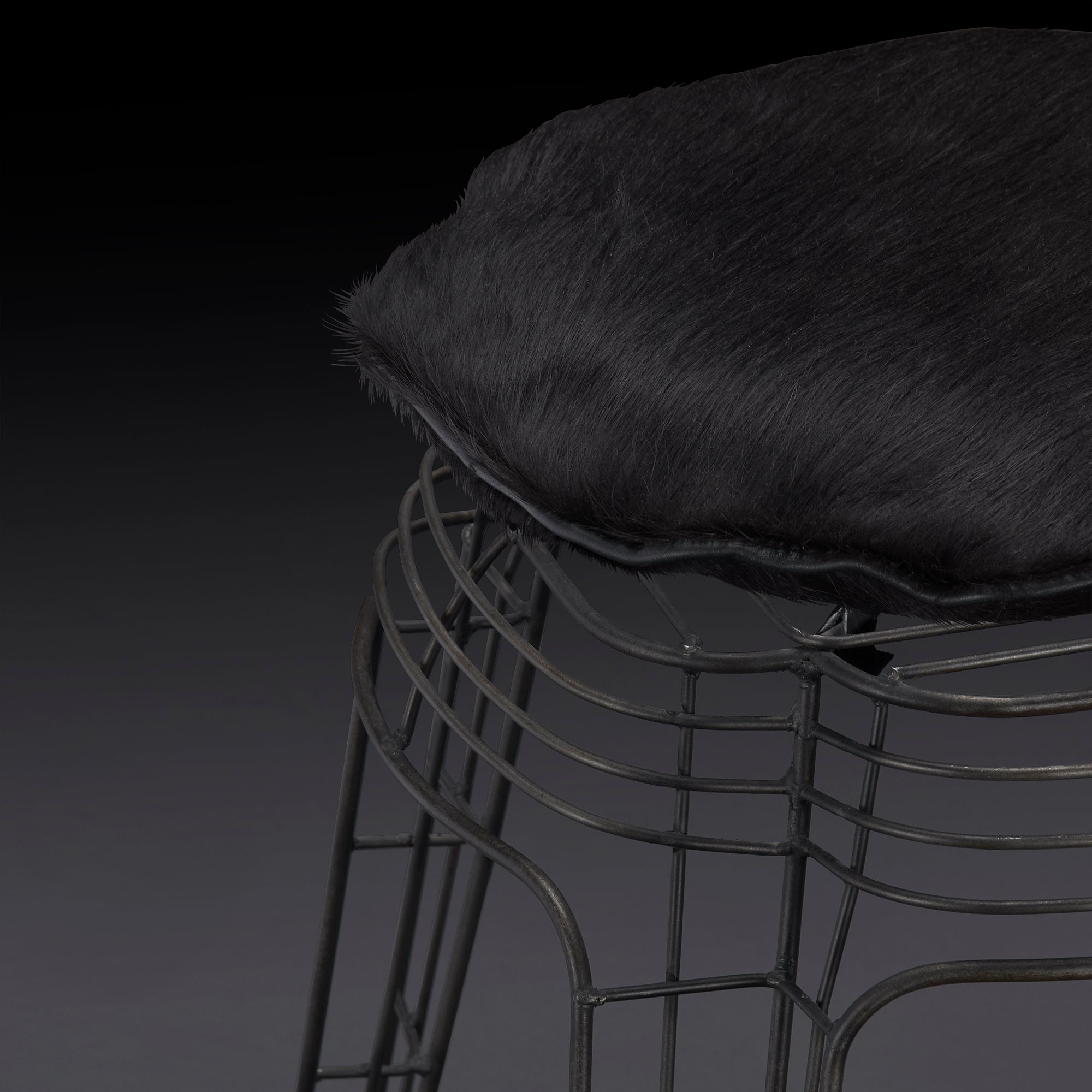 Banco elaborado a base de metal en tono mate, bajo el dominio de la técnica de manufactura tradicional en alambre, su diseño, color y sobre todo, la armonía que esta combinación provoca, la convierten en una excelente opción para darle aún más estilo a tu hogar, el cómodo cojín de asiento es de pelo natural en color negro.