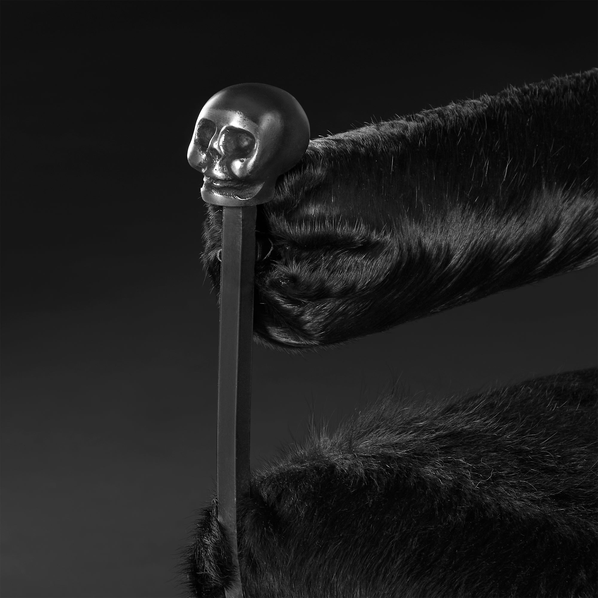 Irreverencia y versatilidad pura, transmitida en ésta pieza única de la colección de Casa Armida. Un elegante trabajo de manufactura y de tapizado que convierten a éste banco, en un importante distintivo, elaborado a base de metal entintado en tono negro con un tapizado de pelo negro natural, con descansabrazos cubiertos de igual manera por pelo negro, este banco esta enmarcado por 4 cráneos en la parte superior, su firme estructura es sinónimo de comodidad a cada momento. Comprueba que los pequeños detalles hacen que nuestro entorno luzca de manera diferente.
