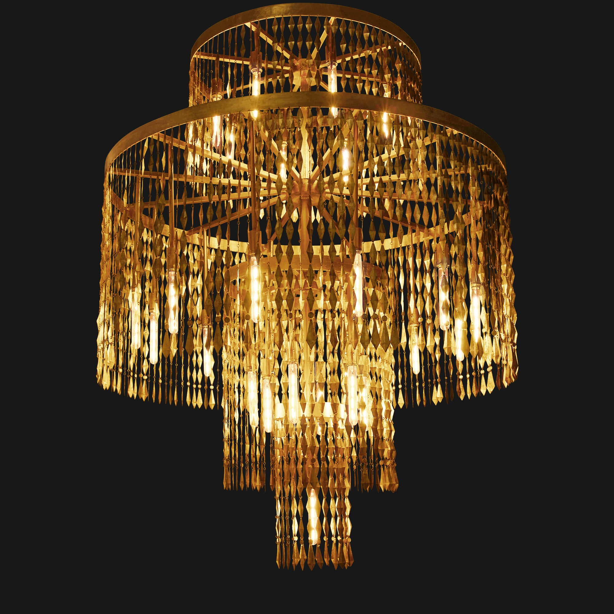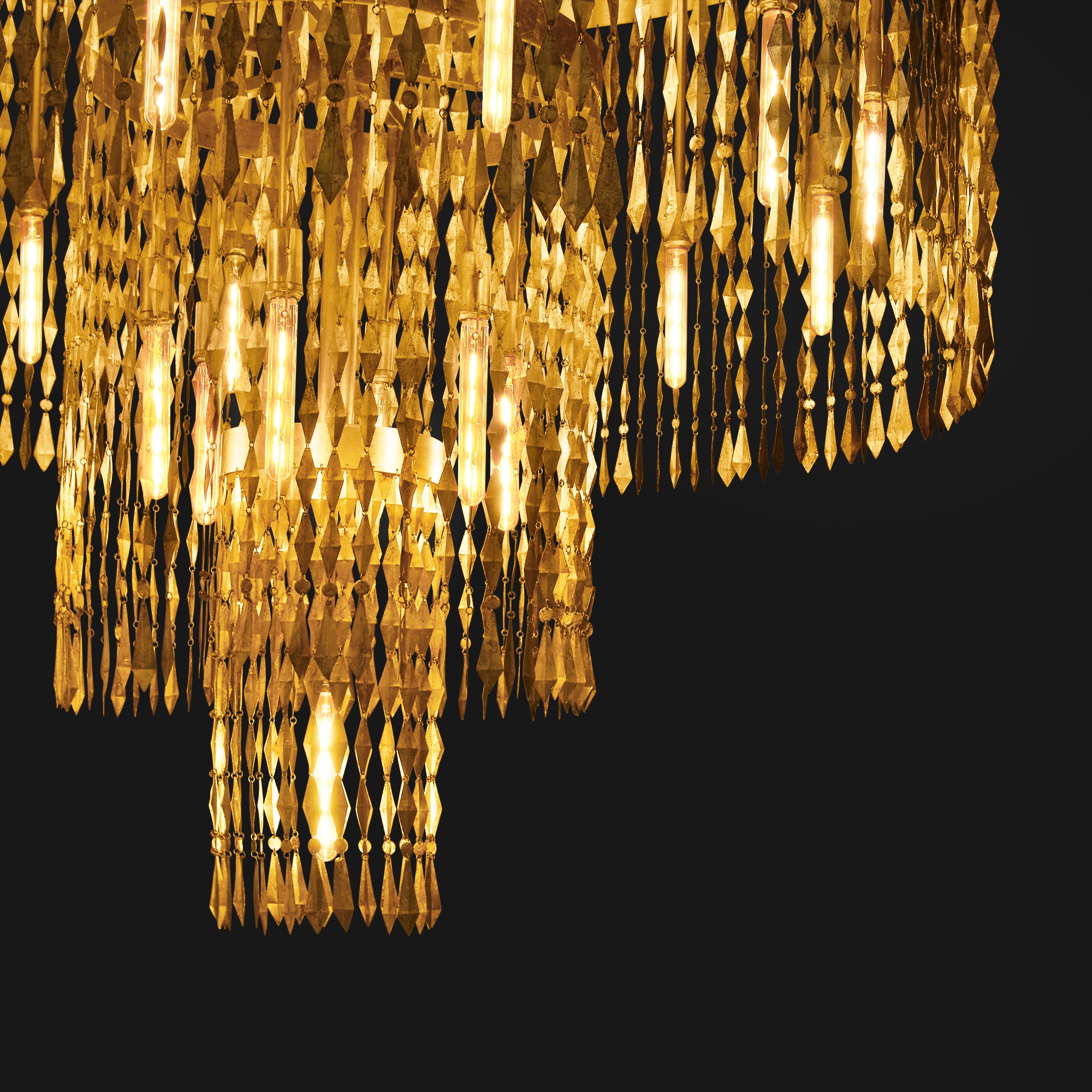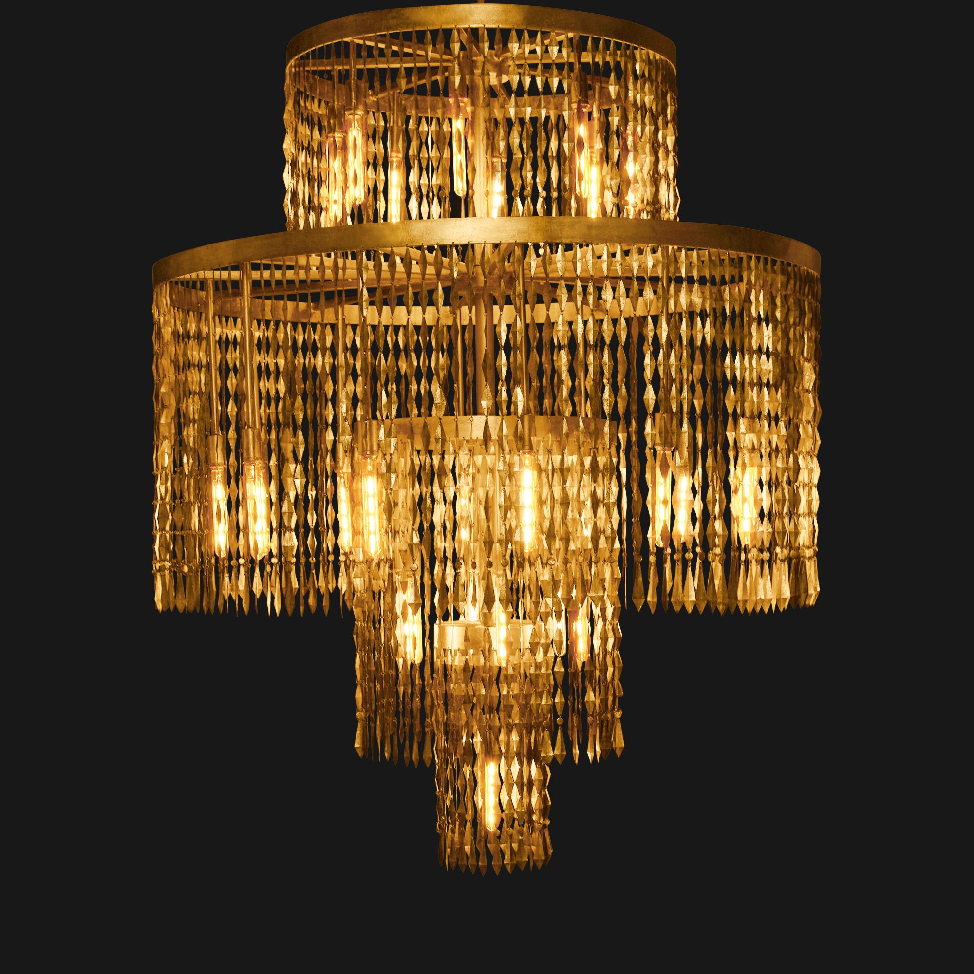 El candil es una excelente opción para decorar y darle personalidad a tus espacios, además de verse bien, iluminará la habitación con elegancia y modernidad, elaborado a mano a base de metal forrado con hoja de oro, este deslumbrante candil se distingue por su estructura en forma de aros intercalados y sus cadenas con hojuelas de hojalata en acabado oro san miguel, sin duda le dará vida a tu espacio convirtiéndolo en una pieza única. Comprueba que los pequeños detalles hacen que nuestro entorno luzca de manera diferente.