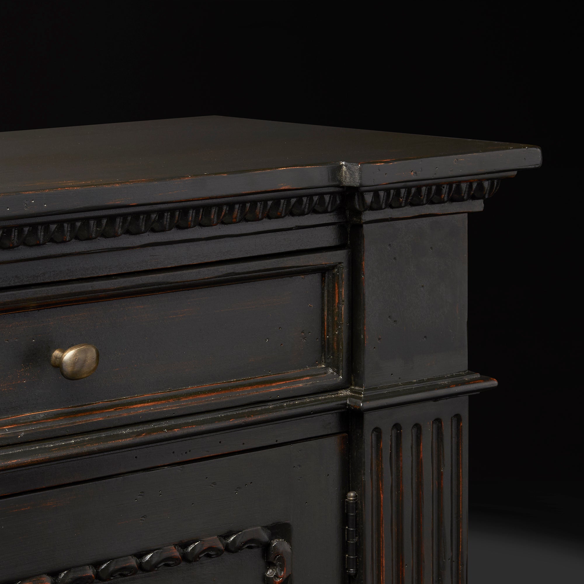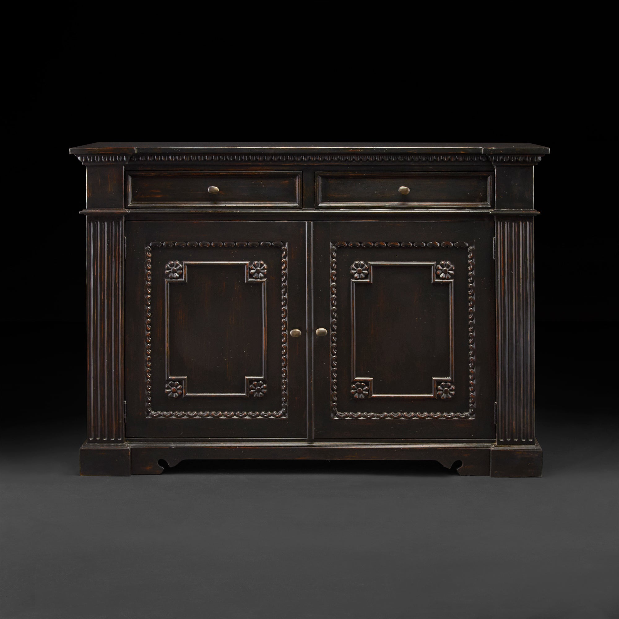 Dentro de tu espacio siempre hay lugar para estos fantásticos complementos de decoración, la elegante cómoda Geraldo tiene estilo clásico, elaborada y tallada en madera entintada en tono obscuro, con un suave desgaste aplicado sobre toda su estructura con jabladeras en bronce, lo mejor en una pieza única.
