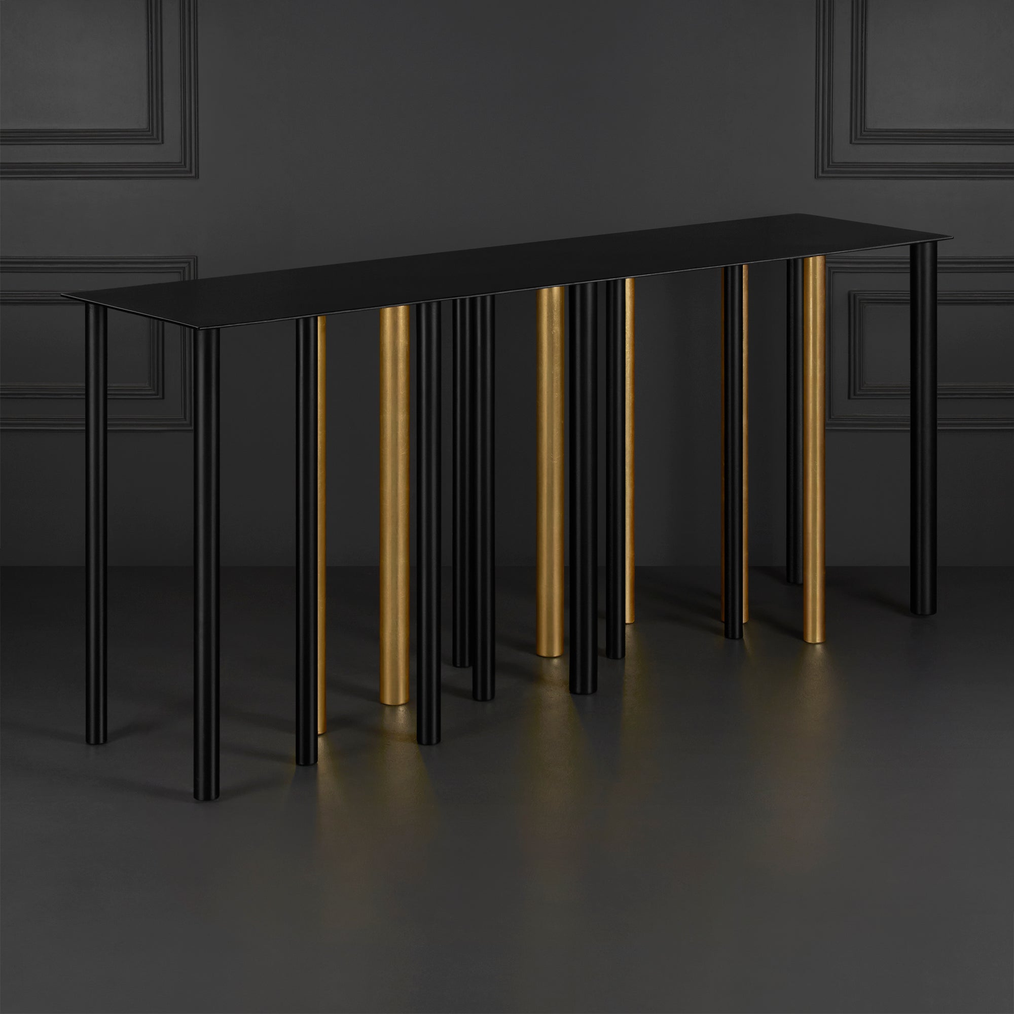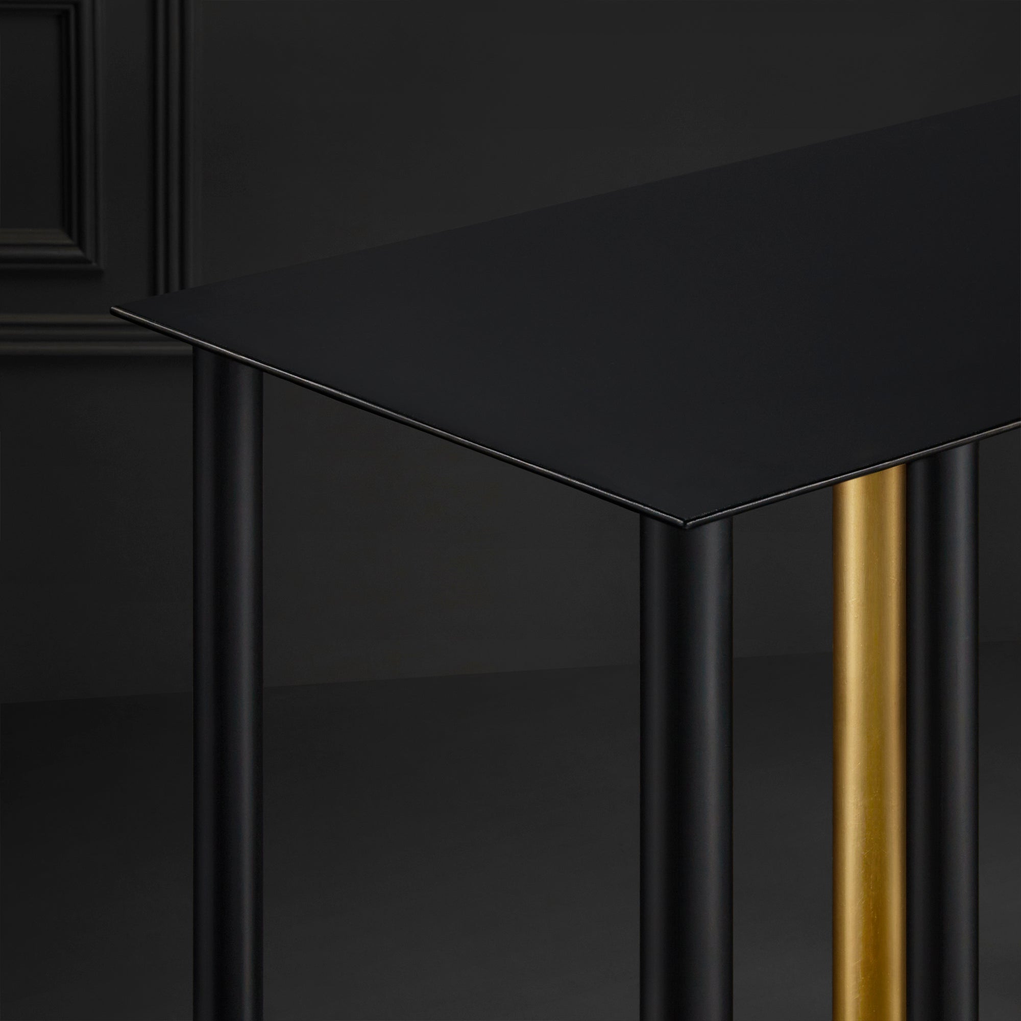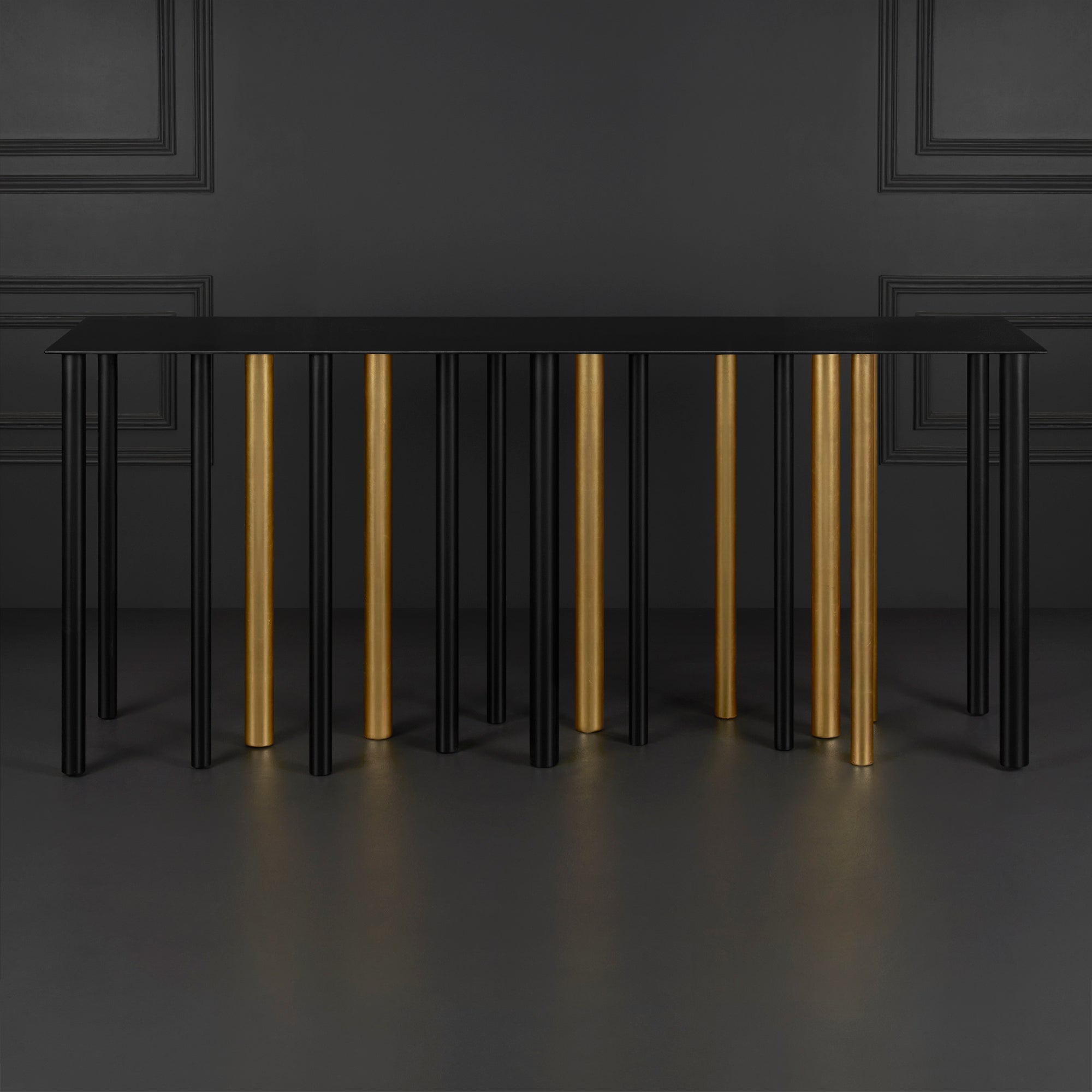 Sin duda, una atractiva y elegante pieza con la firma de Casa Armida. La base de la Consola Castelar, está compuesta por patas de metal en forma tubular, con un acabado aplicado en tonos dorados y negros. Una estilizada pieza manufacturada totalmente a mano, cuya cubierta rectangular es fabricada también en metal.