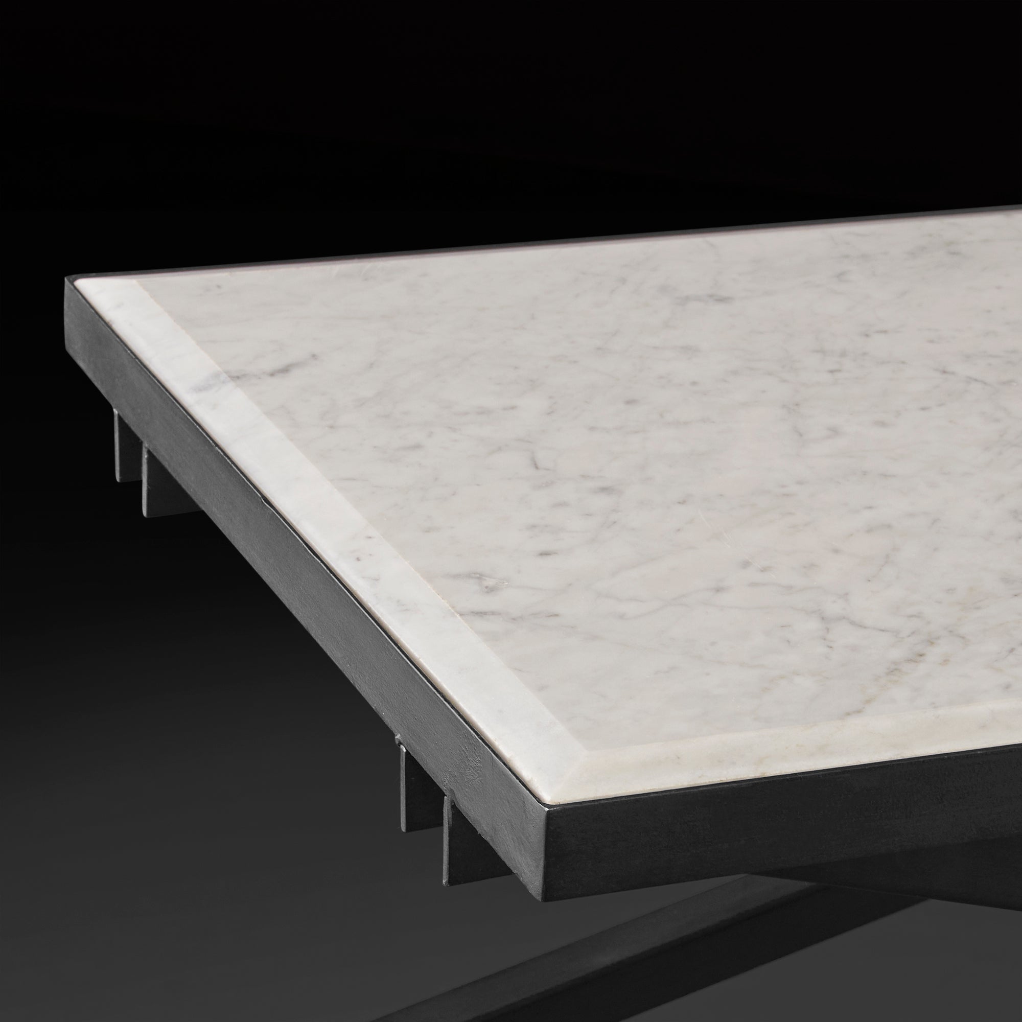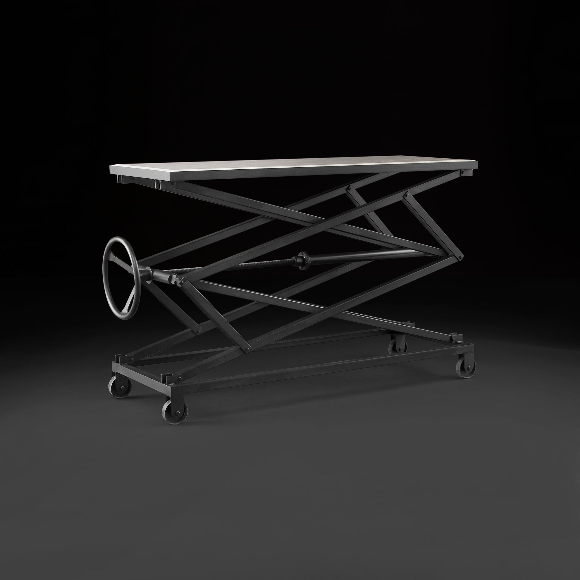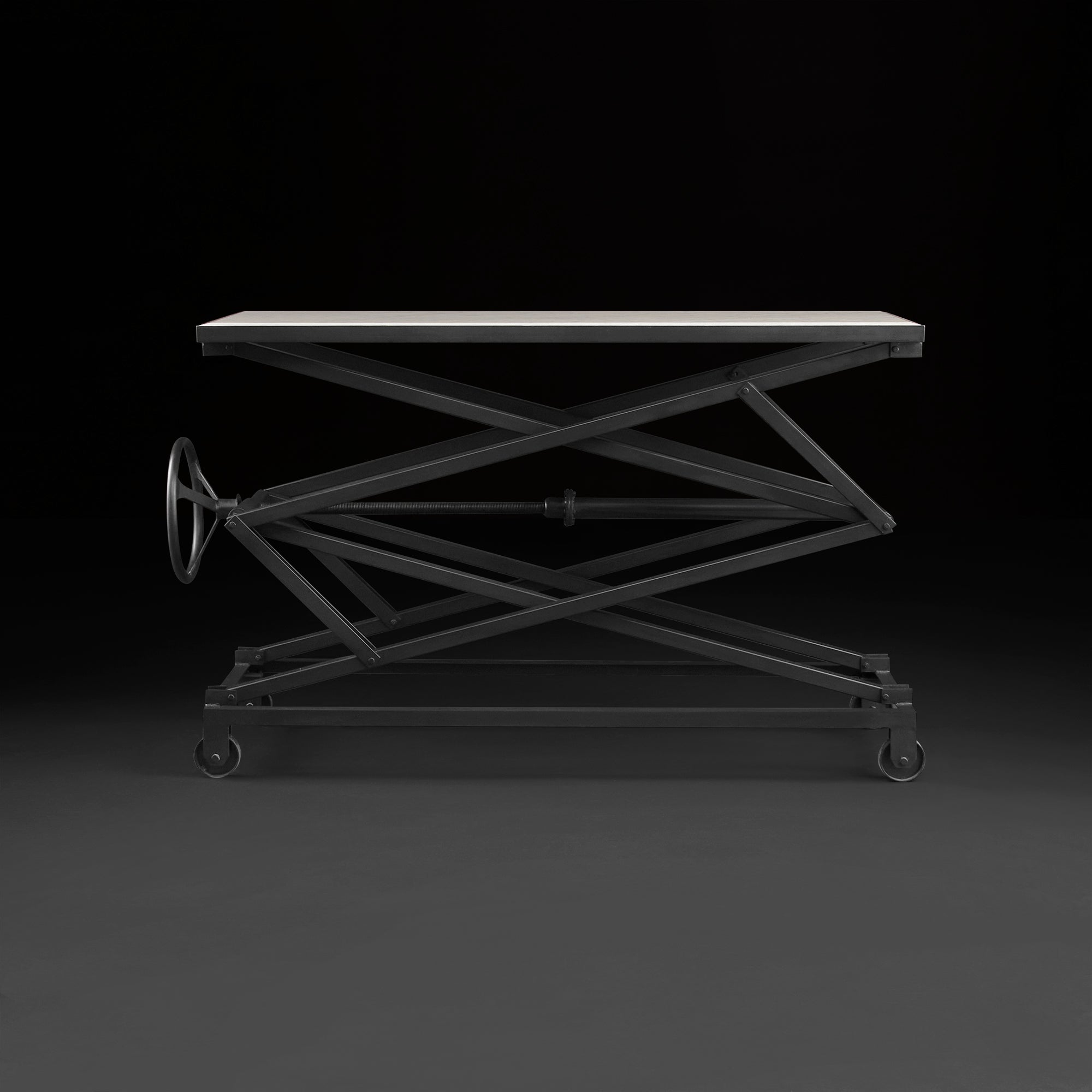 Esta bella consola de altura fija, constituida por líneas limpias y angulares, resulta un complemento decorativo perfecto para cualquier habitación. Su diseño esta inspirado en una consola industrial de elevación hidráulica, la cual resulta original y atractiva, destacando su cubierta de mármol Blanco Carrera, integrando así, un elemento decorativo que destacará cualquiera de tus espacios.