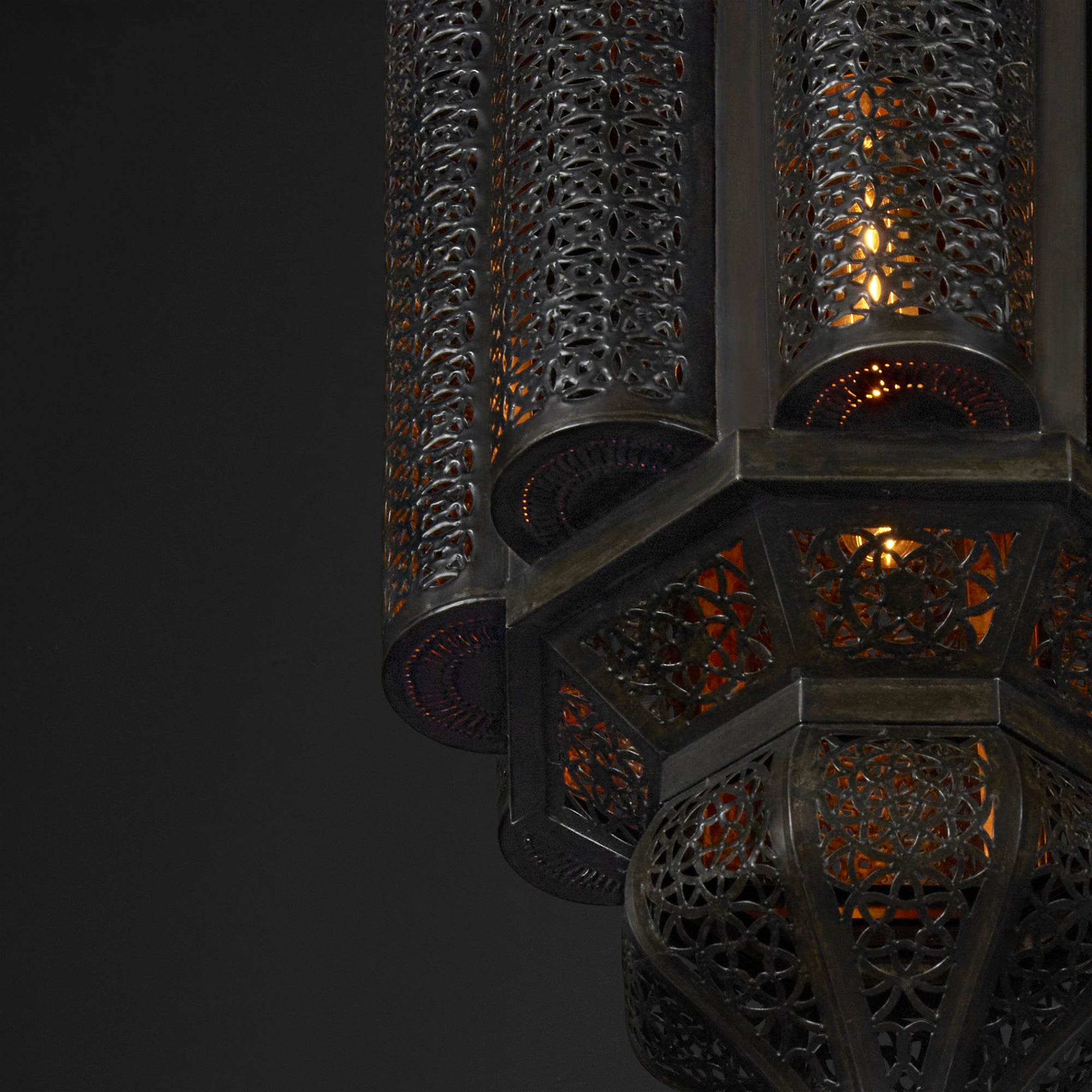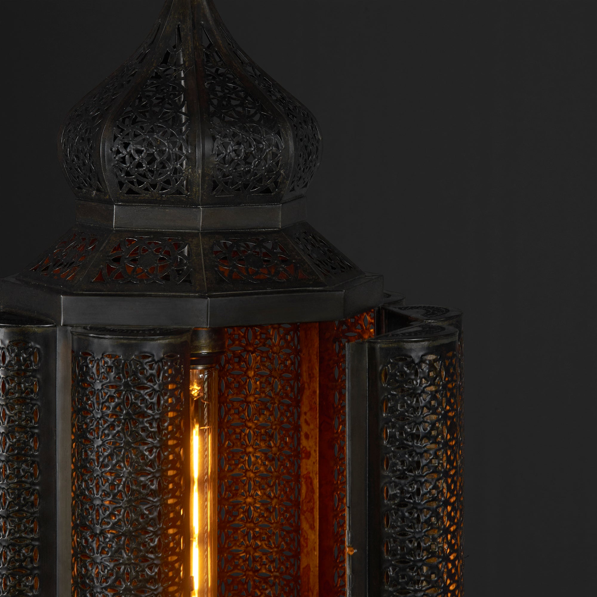 Bella pieza de iluminación de inspiración oriental, elaborada en hoja de lata cobrizada, la lámpara colgante osman muestra un bello trabajo de calado artesanal, a través del cual se emite una cálida iluminación al encenderse.