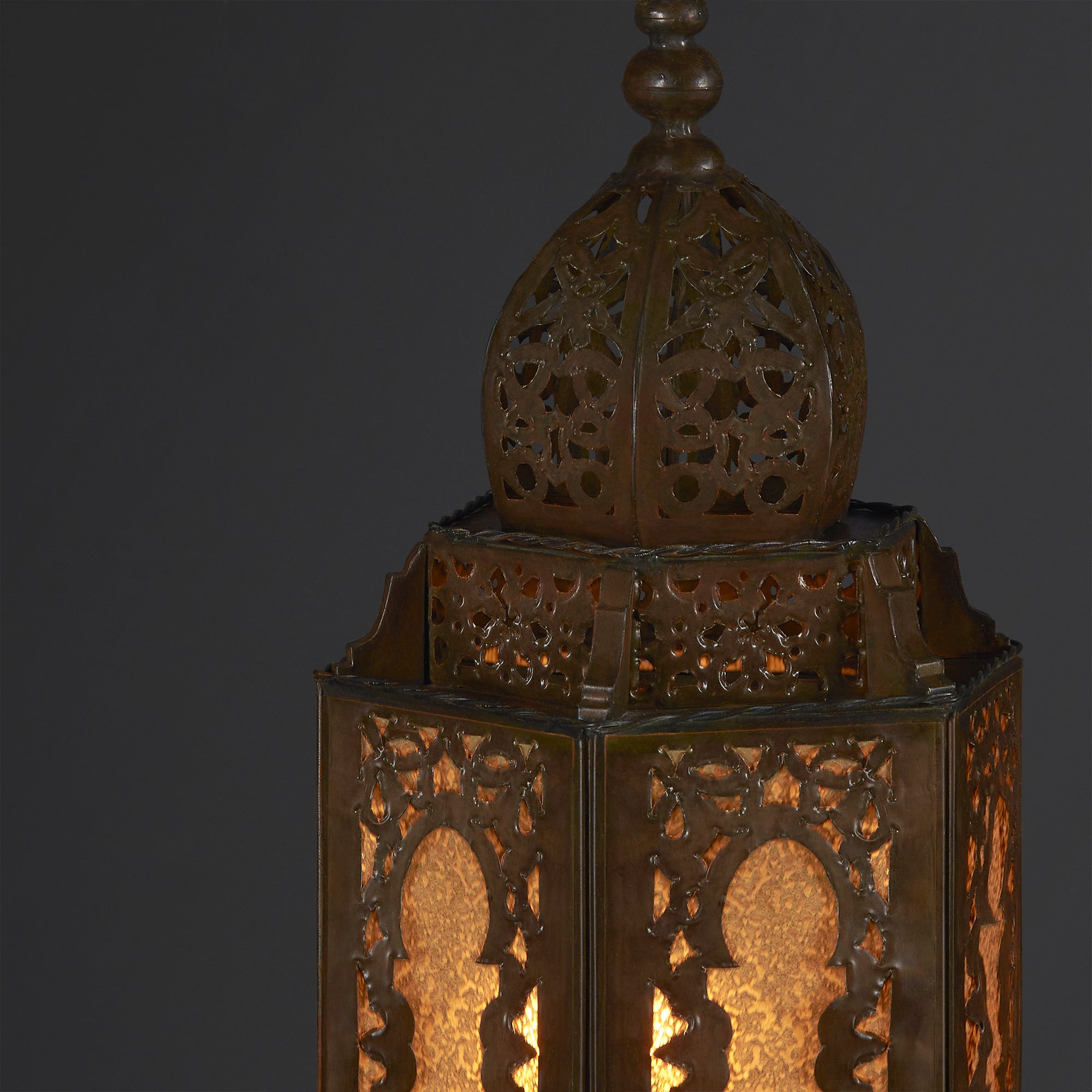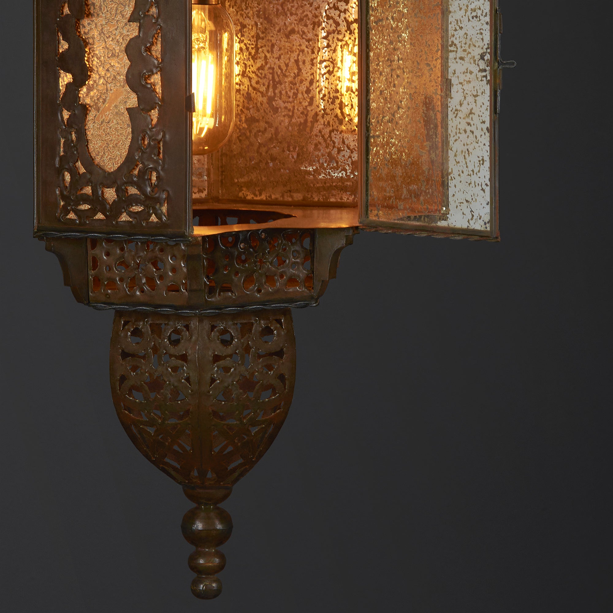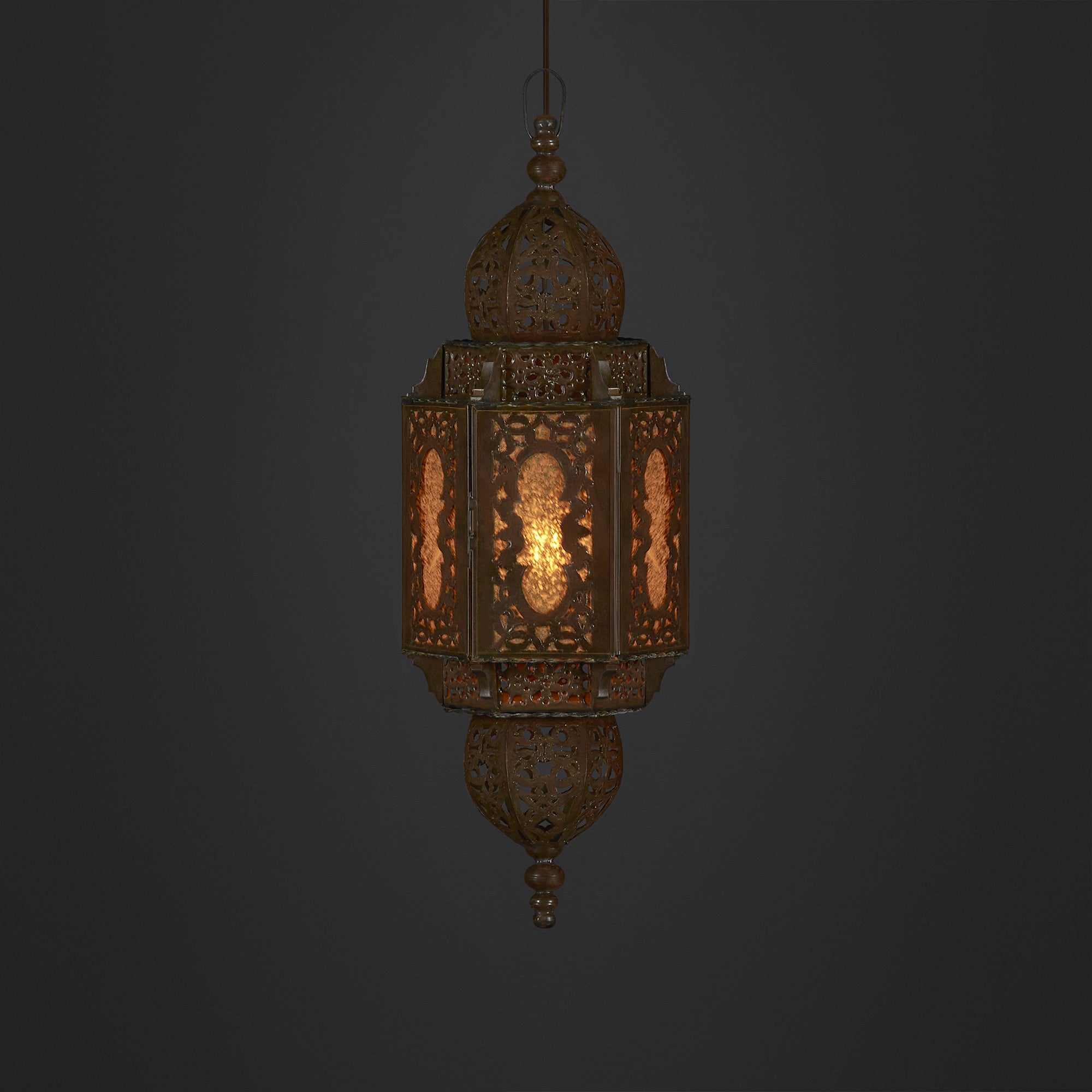 Sin duda, una bella opción de iluminación que muestra el talento artesanal aplicado en cada una de sus partes. Nuestra Lámpara Colgante Gótico Calado esta compuesta por placas de Espejo Viejo Dorado y decorada en su totalidad, con diseños tradicionales del calado en hoja de lata, rematando con un acabado Cobrizado clásico.