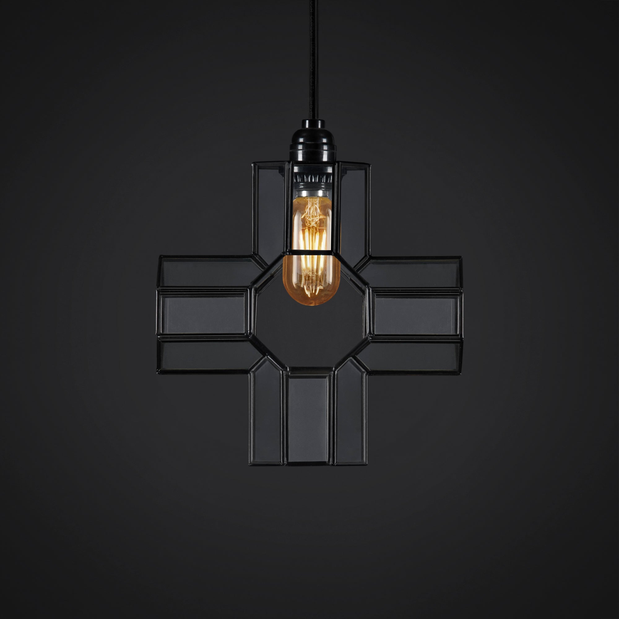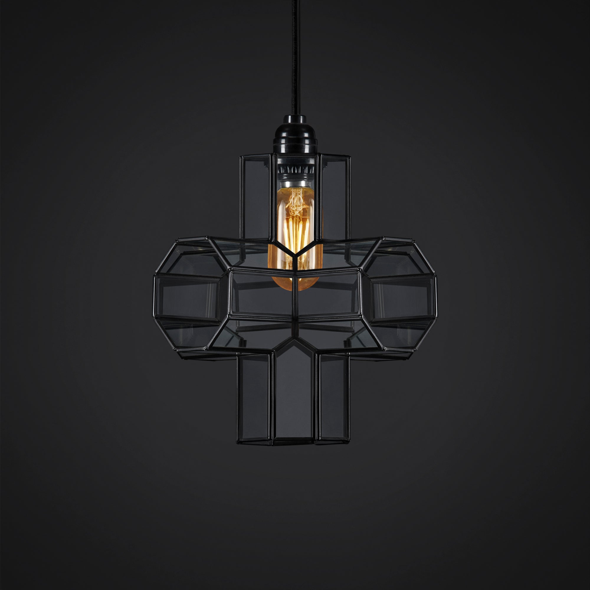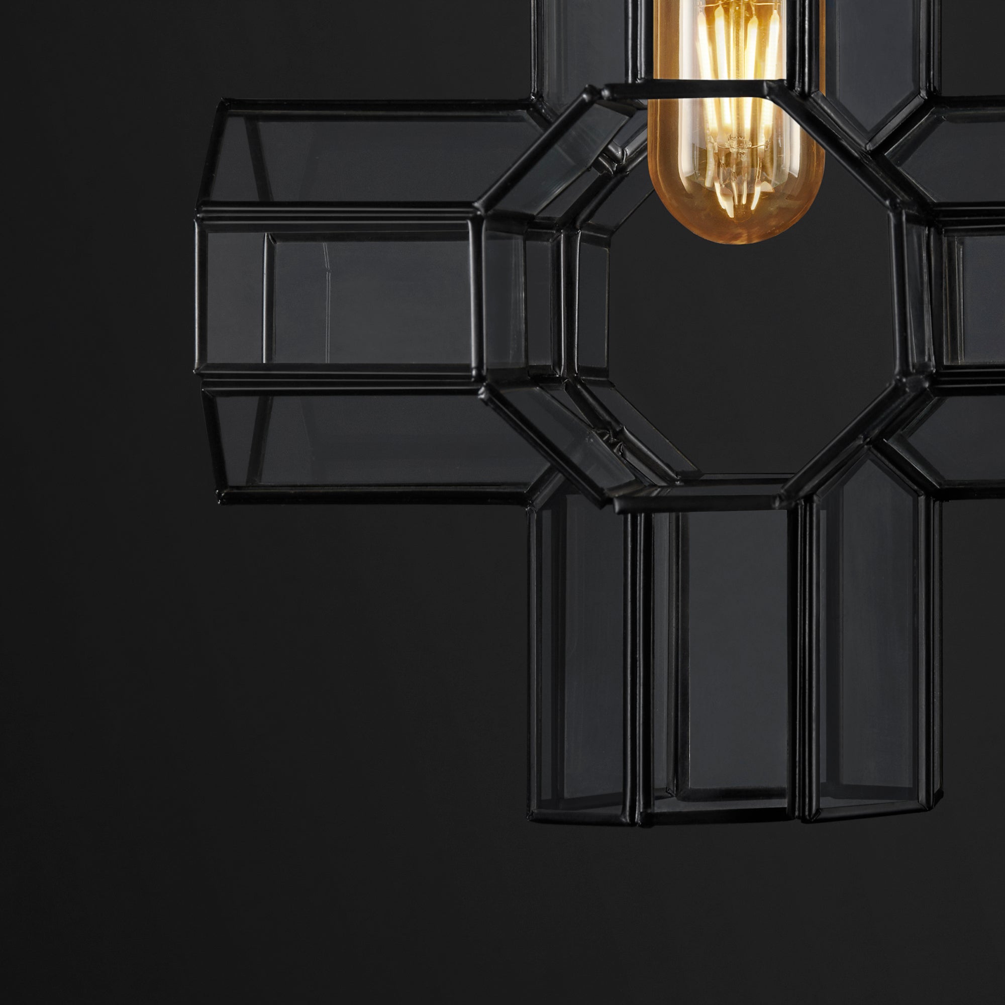Una bella opción de Lámpara Colgante de forma de cruz, compuesta por hojas de vidrio claro unidas por cañuela metálica como pantalla, resultando en una atractiva pieza que destaca una gran habilidad artesanal en su manufactura.