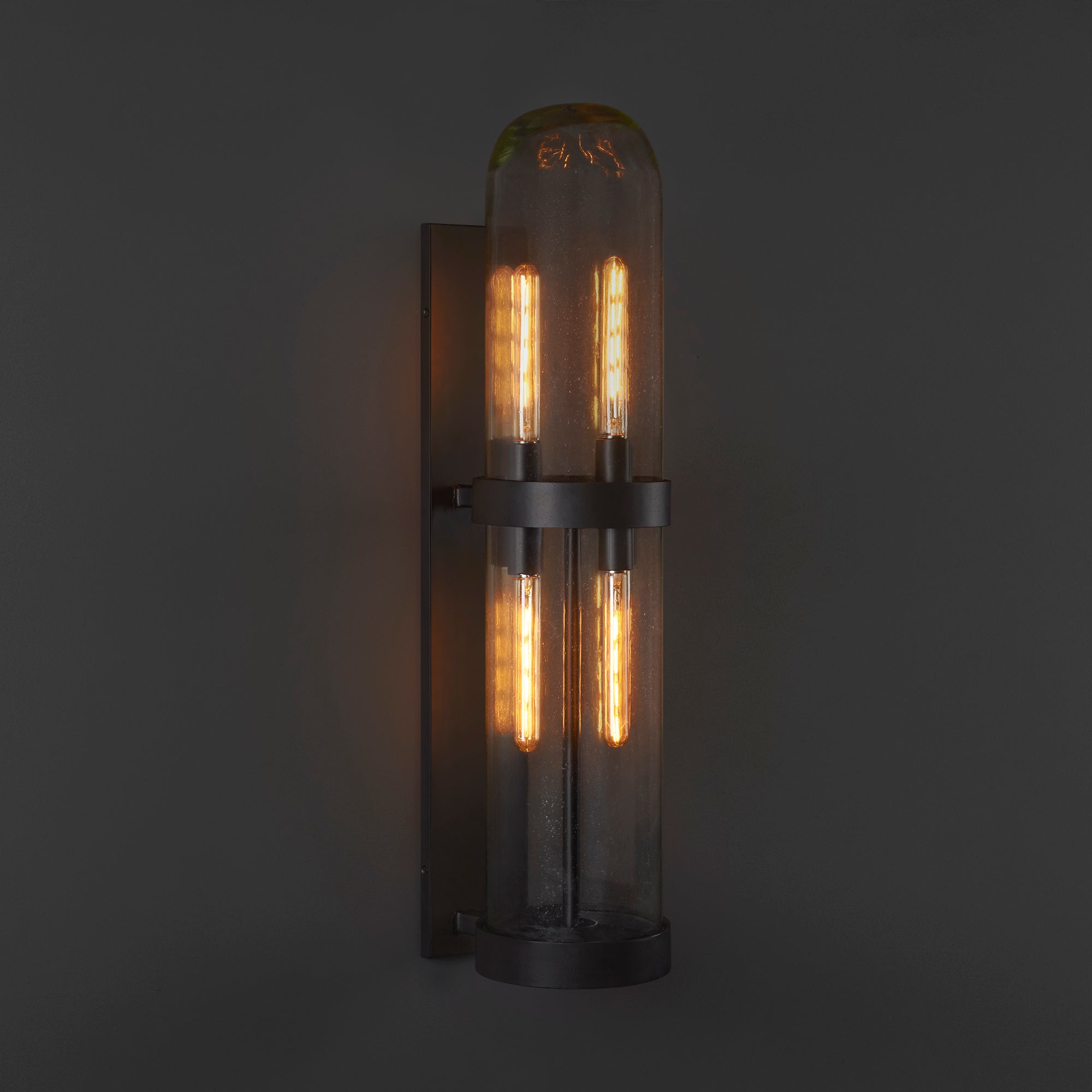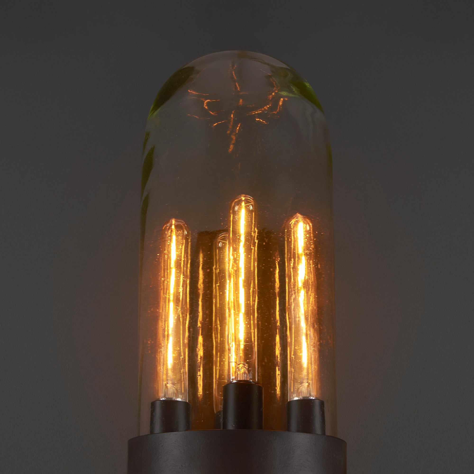 Deslumbrante lámpara de muro de estilo industrial, compuesta por una sólida estructura de metal, ofreciendo estabilidad y diseño, pieza integrada por dos niveles de luces, completando un conjunto de iluminación de 8 focos, resguardados por un largo capelo fabricado en vidrio soplado.