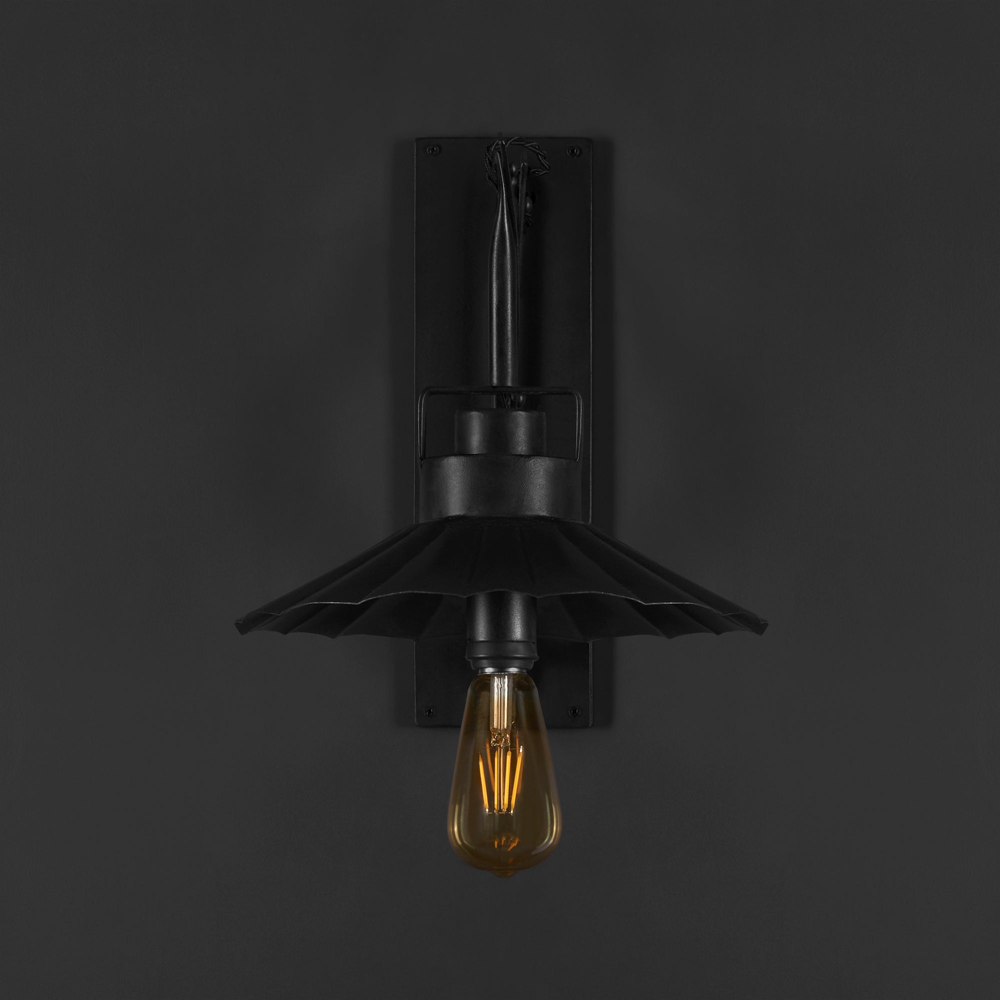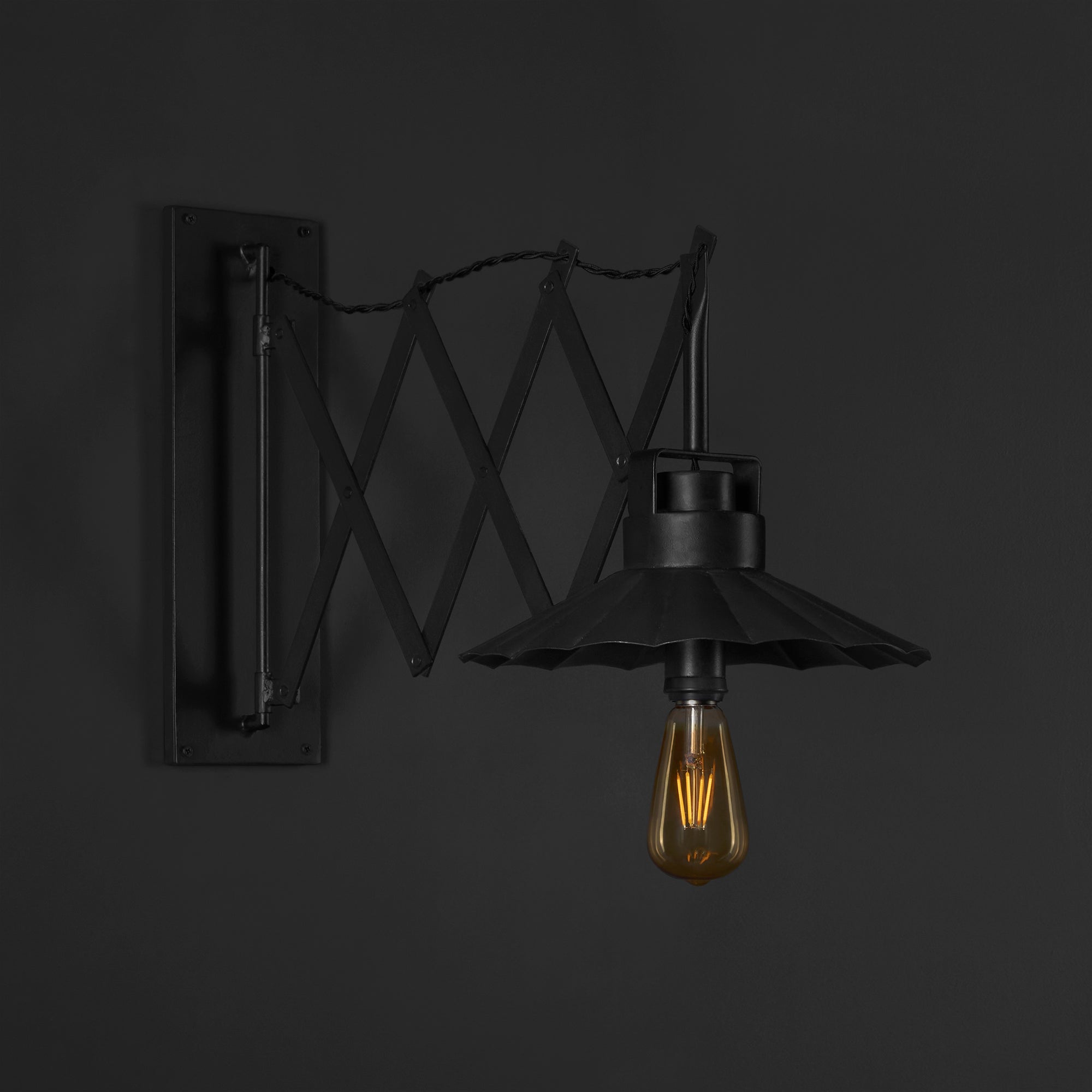 Emblemática lámpara de muro de estilo industrial que resalta su diseño y elegancia, pieza compuesta de una sólida placa de aluminio con una extensión en forma de acordeón que sostiene a una pantalla compuesta de placas de hoja de lata unidas con cañuela cobrizada. Comprueba que los pequeños detalles hacen que todo tu entorno luzca de manera diferente.