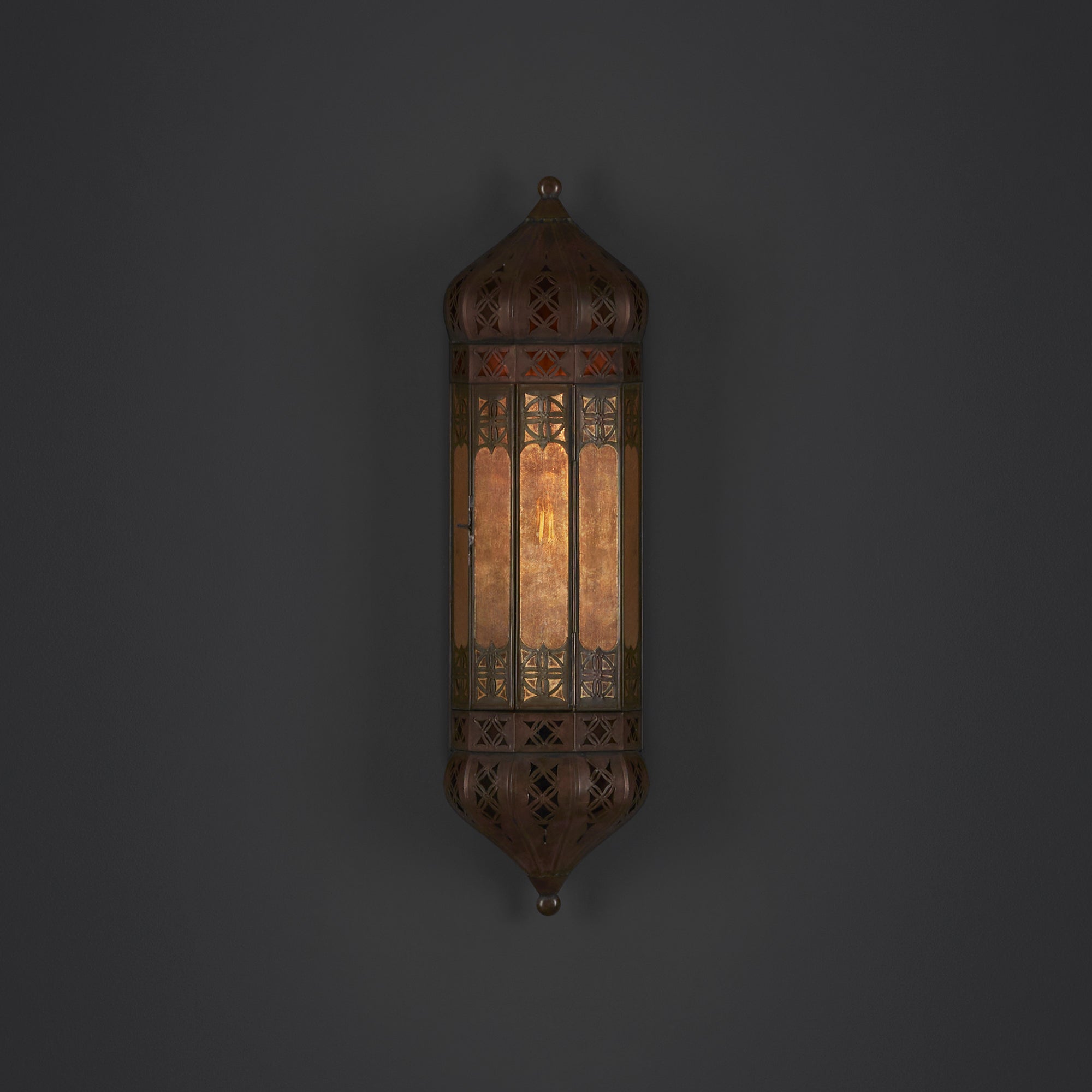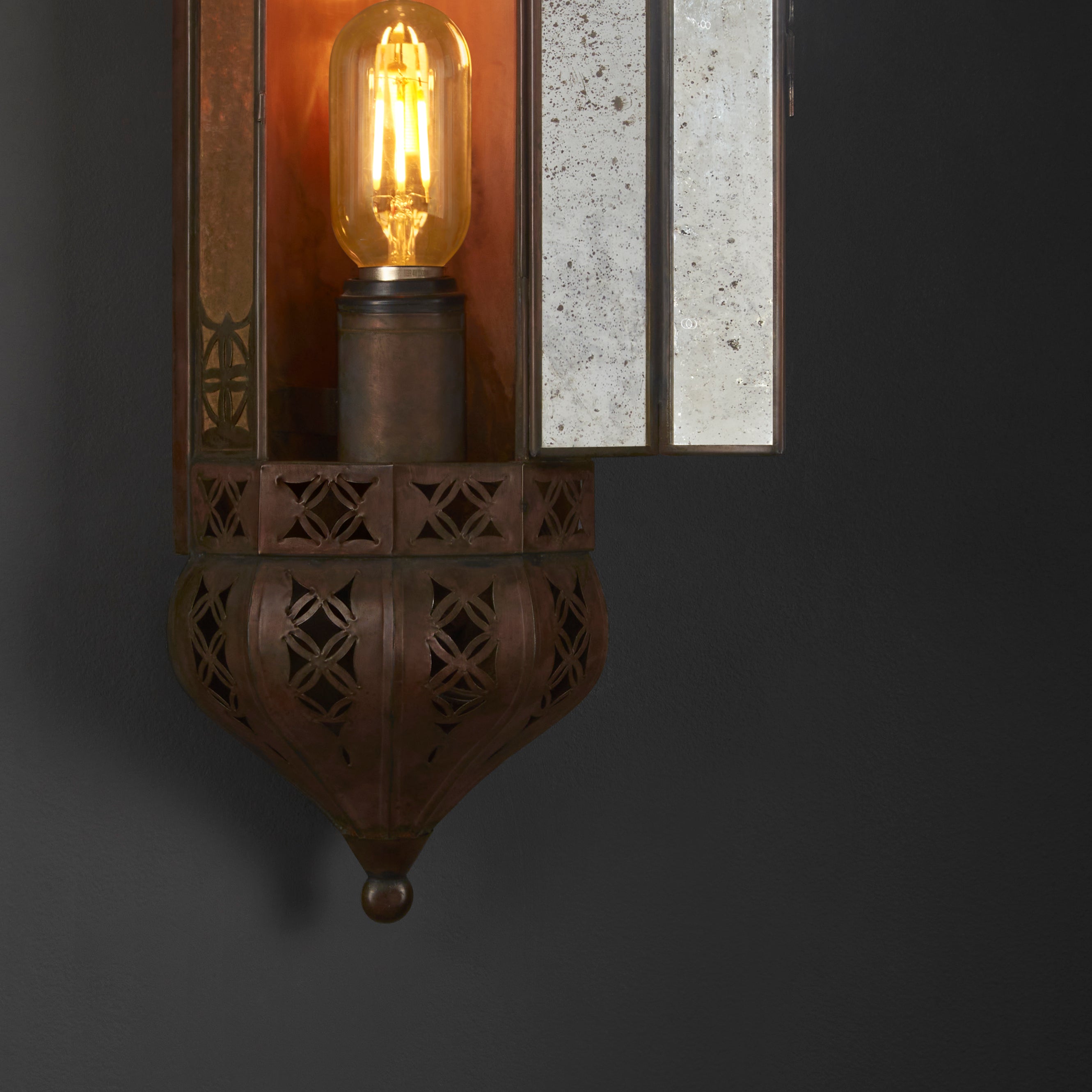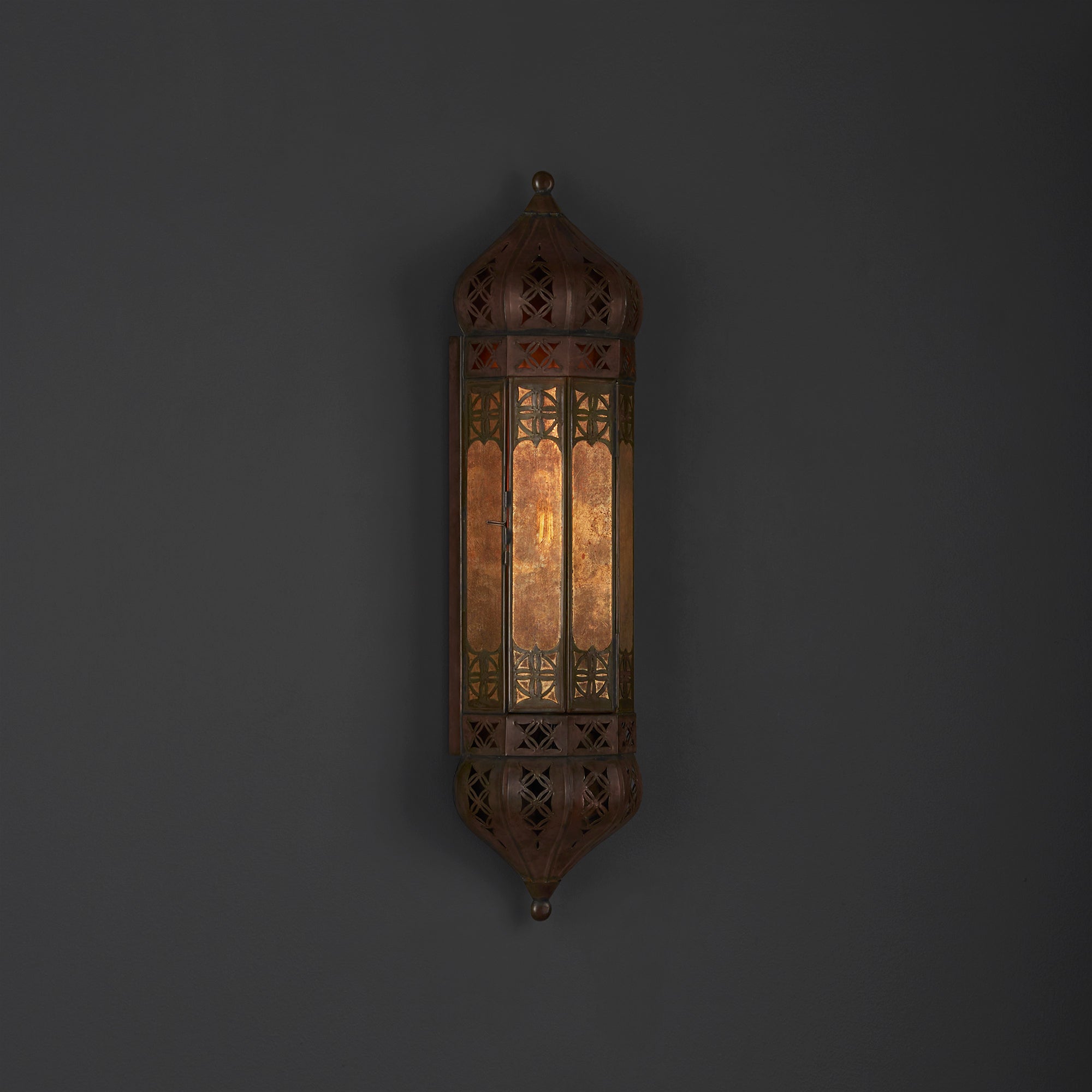 Bella pieza de iluminación de inspiración oriental, elaborada en Hoja de Lata Cobrizada y Espejo Viejo Dorado, la Lámpara de Muro Riva muestra un bello trabajo de calado artesanal, a través del cual emite una cálida iluminación al encenderse.