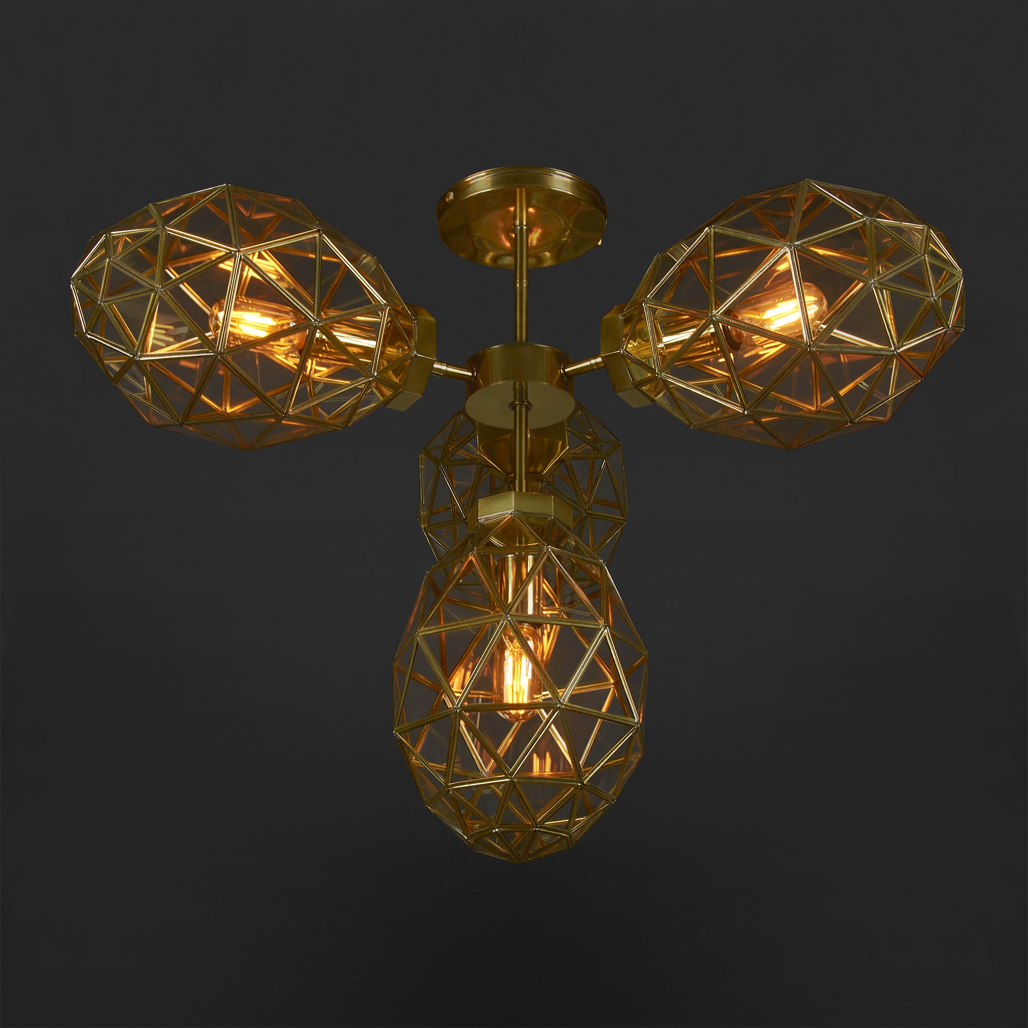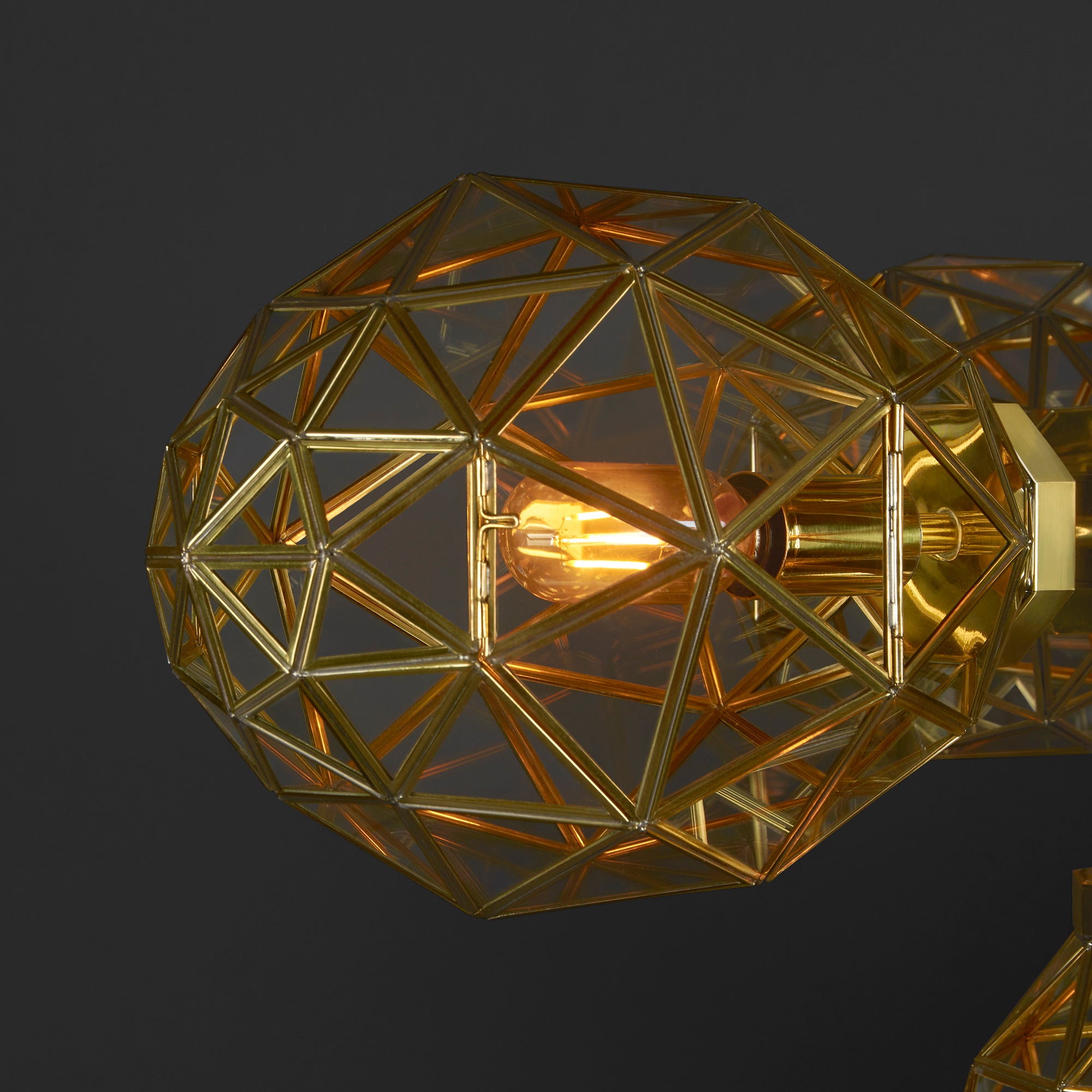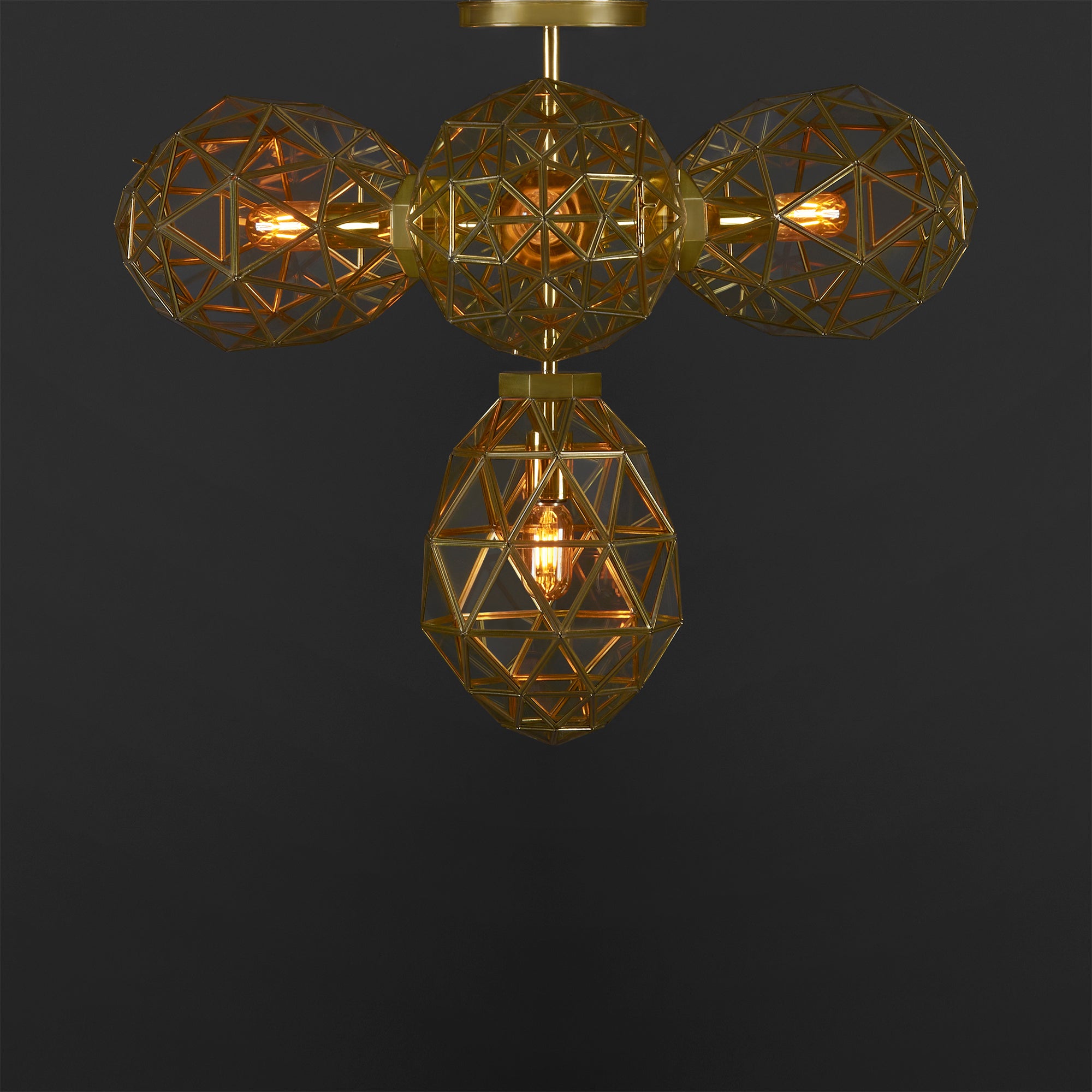 Majestuoso Candil compuesto por dos niveles de iluminación, un trabajo de manos artesanales que deslumbra, sin duda, por su creatividad y diseño, el Candil López de 4 Luces es fabricado en latón. Cada una de sus pantallas está conformada por triángulos de vidrio enmarcados de forma individual mediante cañuela de metal, formando una bella esfera en conjunto.