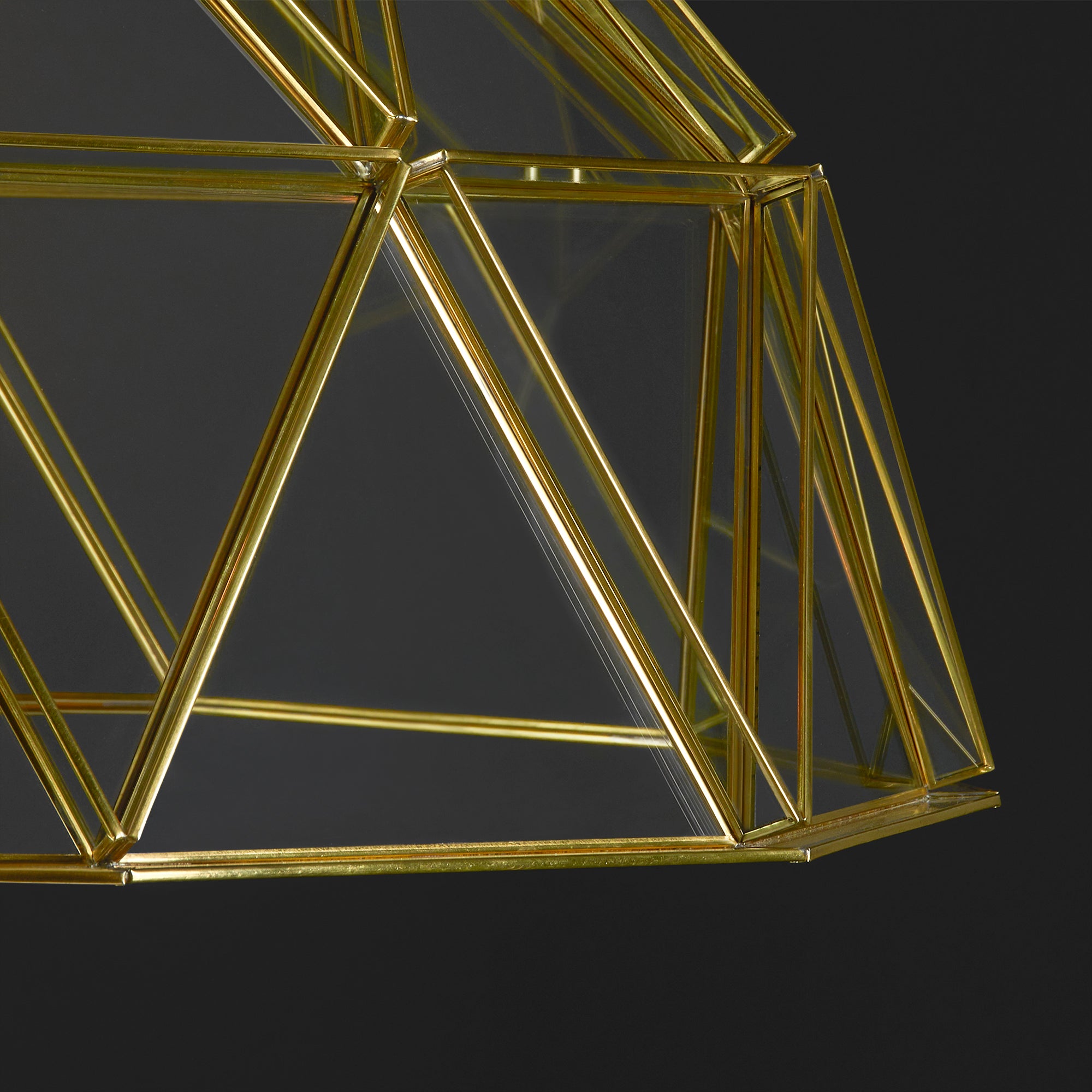Bella lámpara de techo, cuya pantalla es elaborada a base placas de vidrio claro, perfectamente unidas y con cañuela. Dicha pantalla se mantiene unida al techo por un tubo sólido de latón.