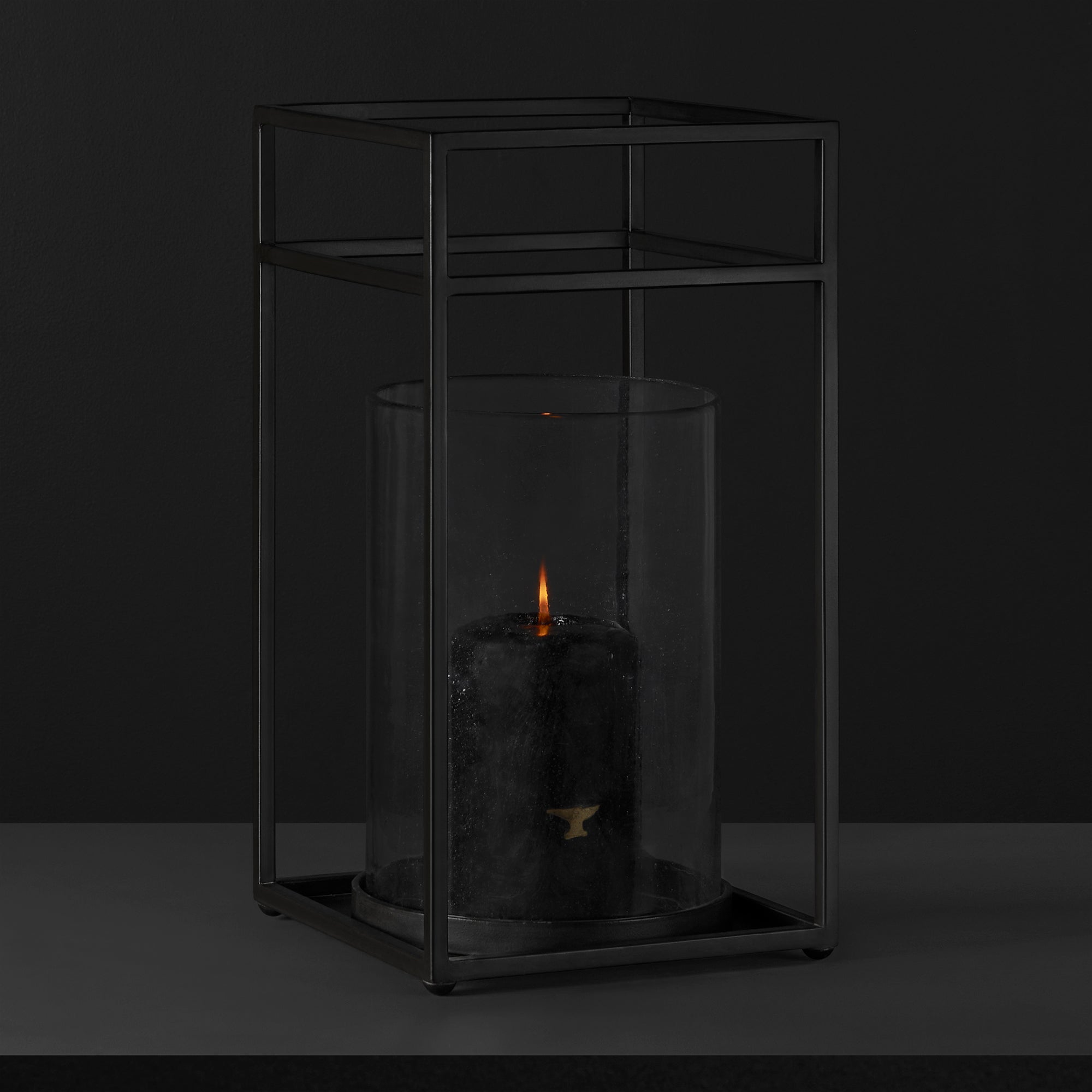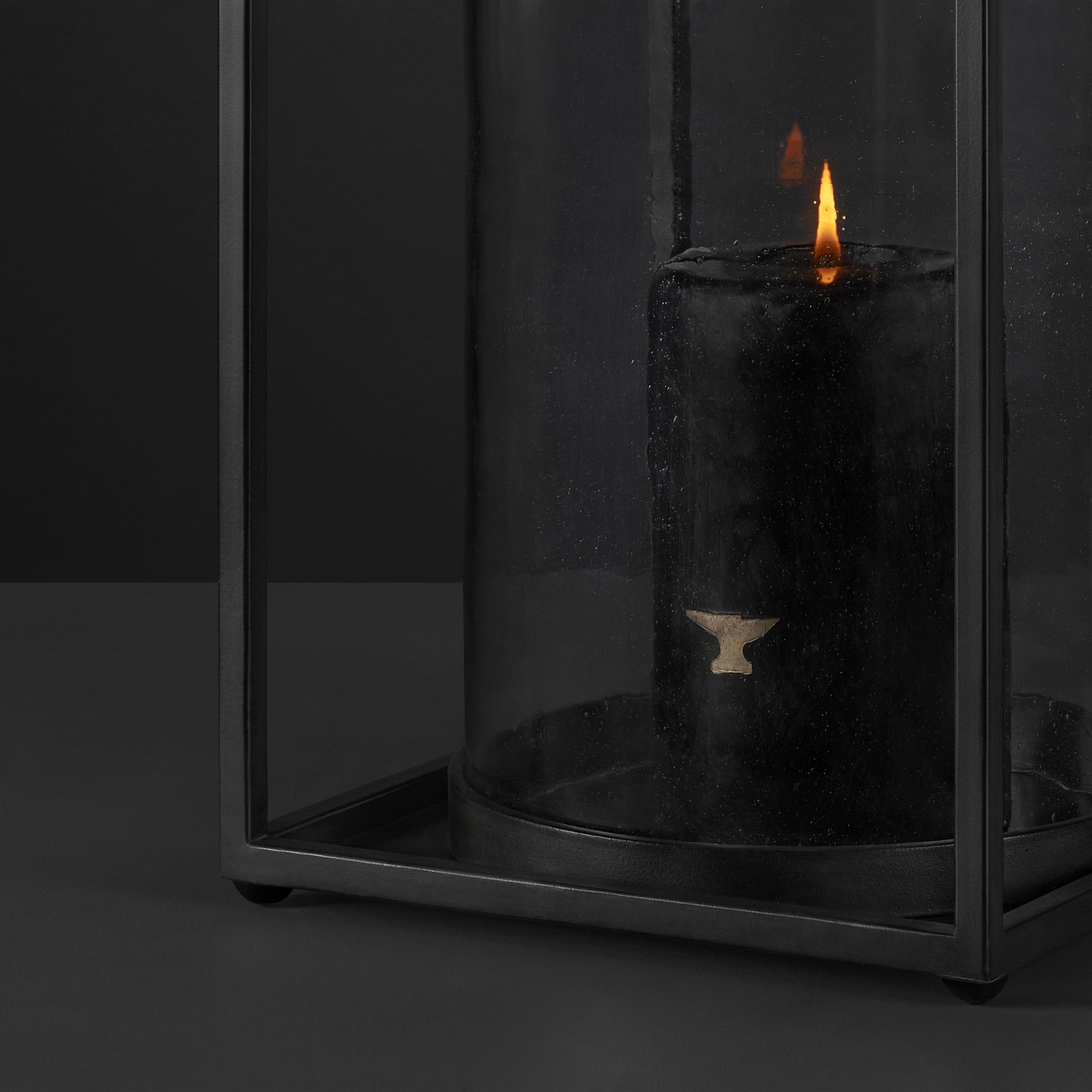 Cálida opción decorativa para tus espacios, la linternilla alex es de forma rectangular, manufacturada artesanalmente y compuesta por una pantalla circular de vidrio soplado transparente, así mismo, protegida por un armazón de metal en acabado tinta y laca.