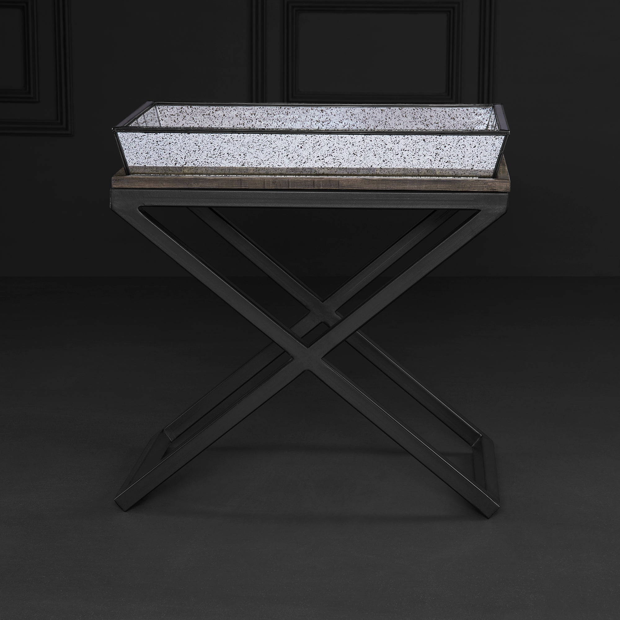 Elaborada a mano a base de metal con diseño de líneas entrelazadas. la base de la cubierta es una tapa de madera con una charola sobrepuesta elaborada en espejo con efecto jaspeado.