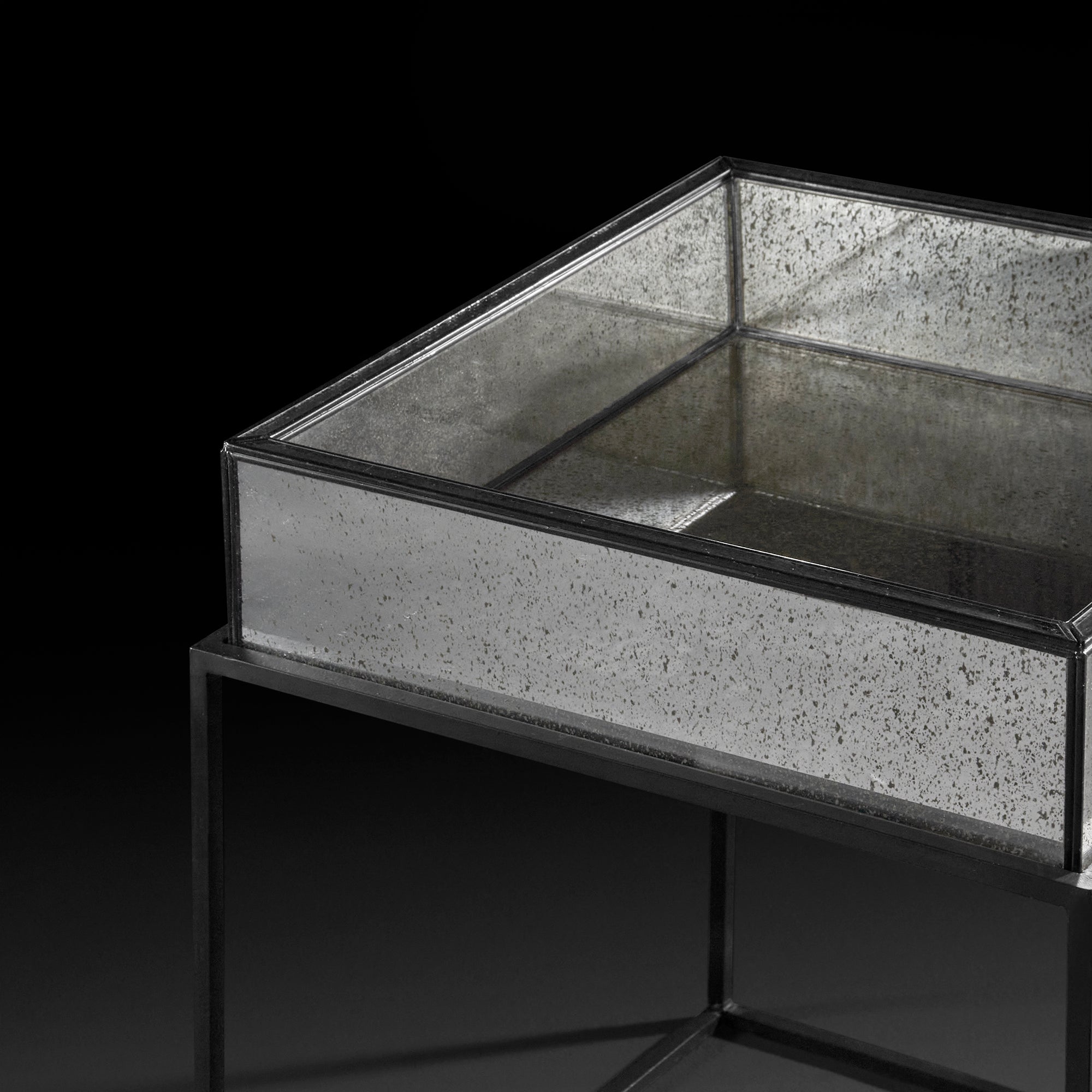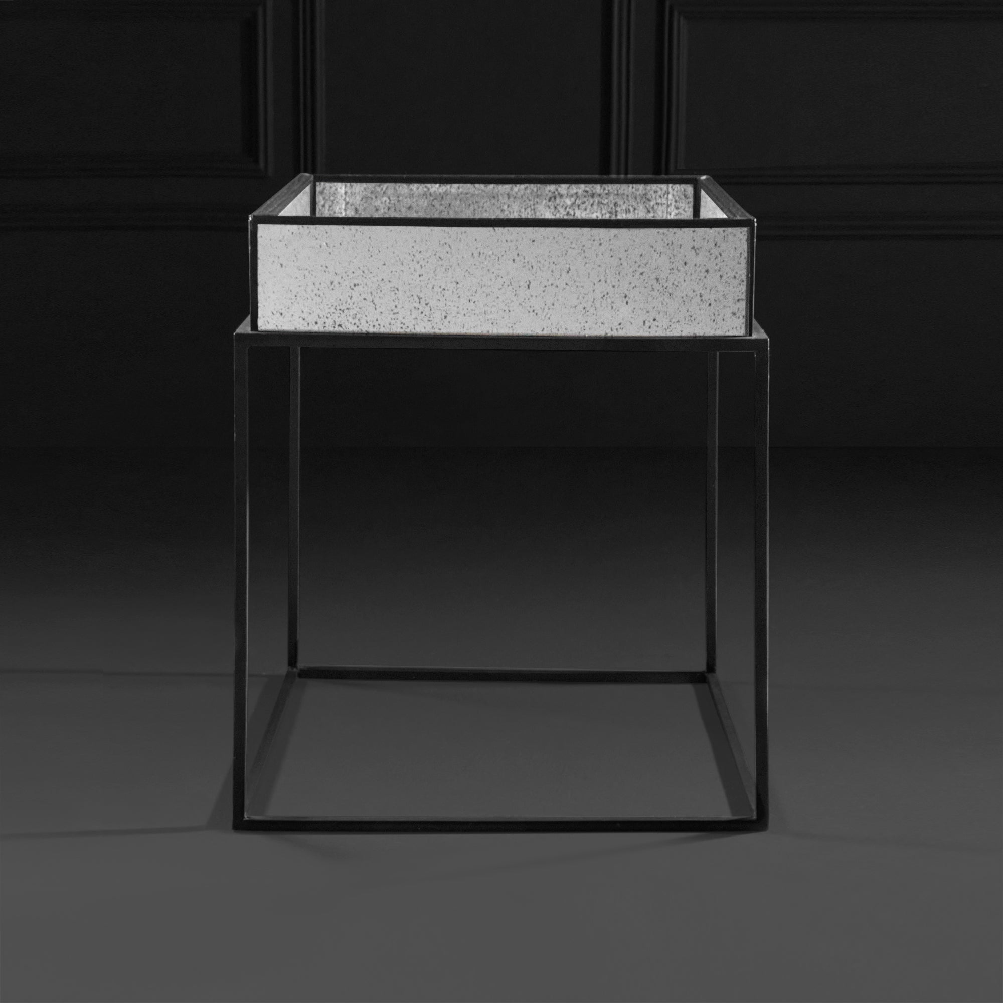 Elaborada a partir de una base metálica, con una cubierta sobrepuesta en forma de charola elaborada a base de espejo plateado, creando un diseño original el cual le permitirá adecuarse a cualquier ambiente.