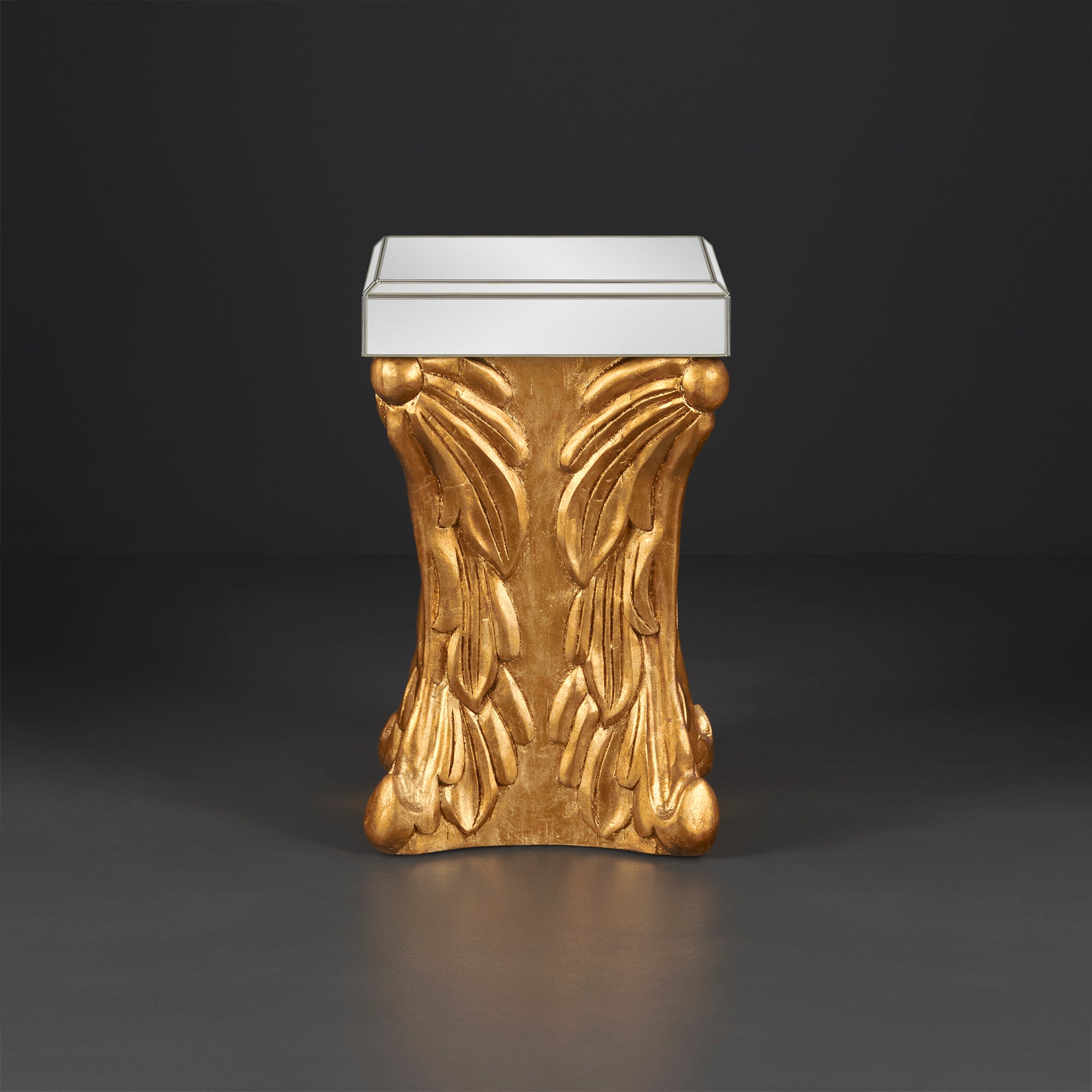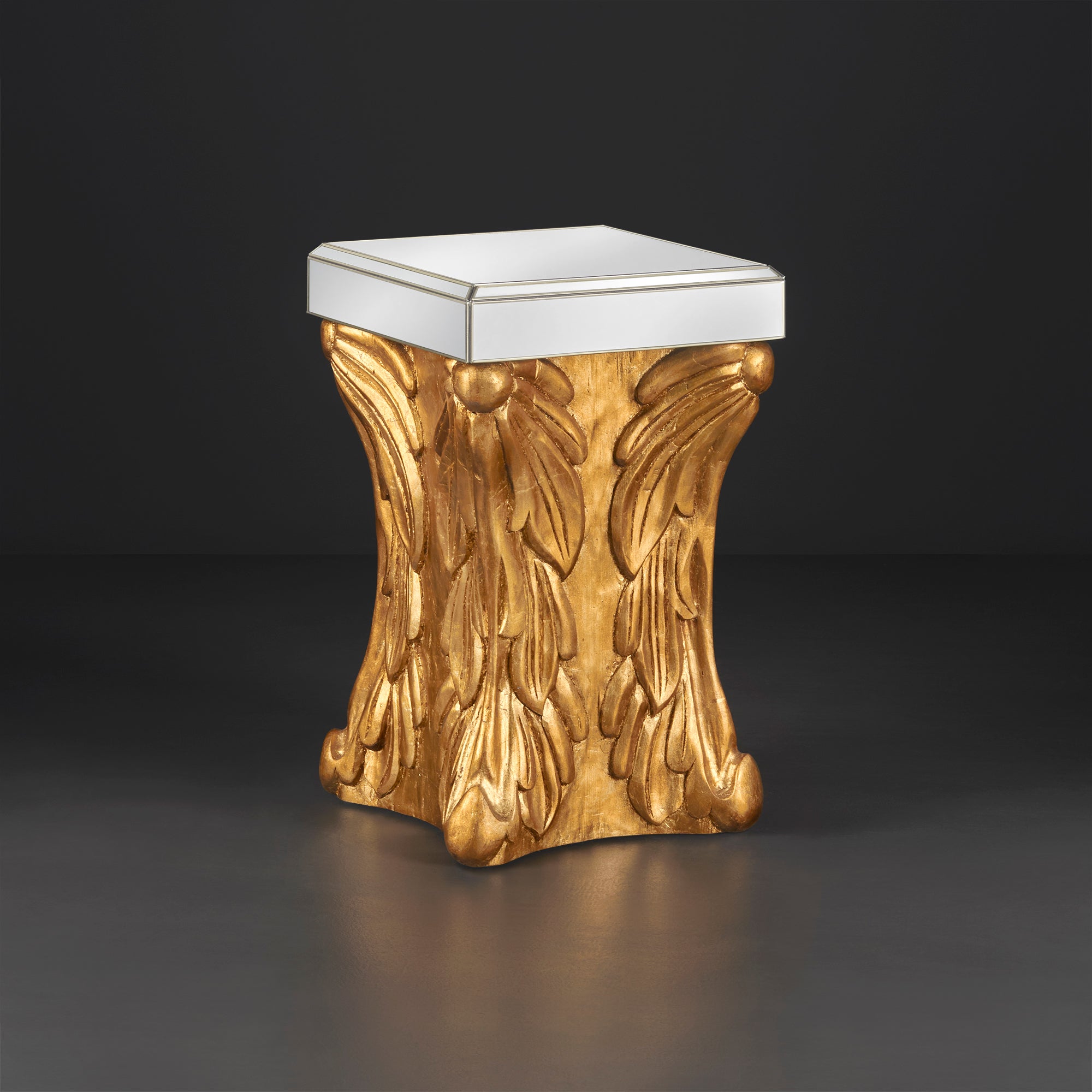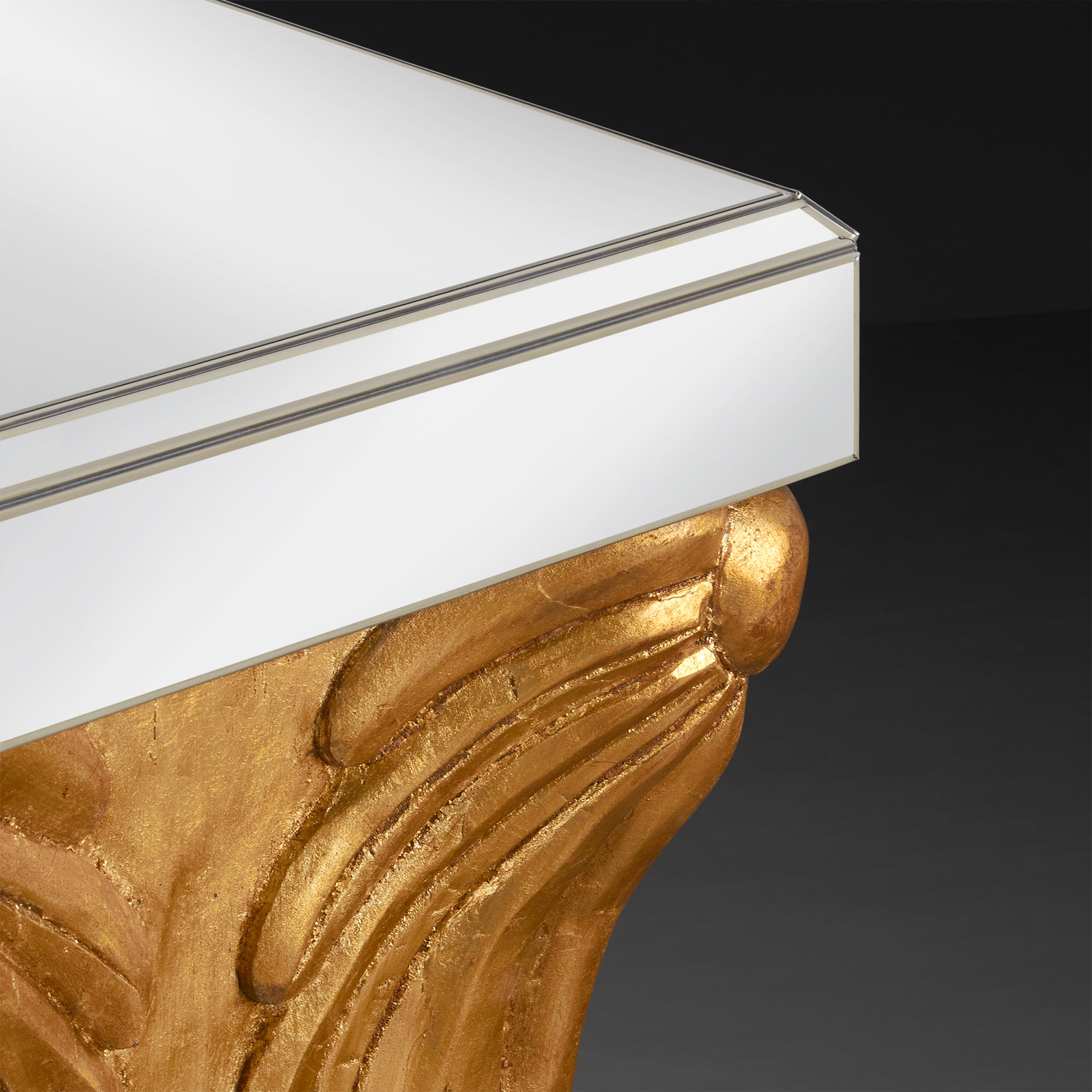 Esta mesa con un estilo genuino esta conformada por una base solida de madera tallada a mano y forrada en hoja de oro con una ligera capa de laca, la cubierta es de espejo jaspeado, unido por cañuela. Su diseño elegante le aporta peso visual lo cual permitirá adaptarse a cualquier área.