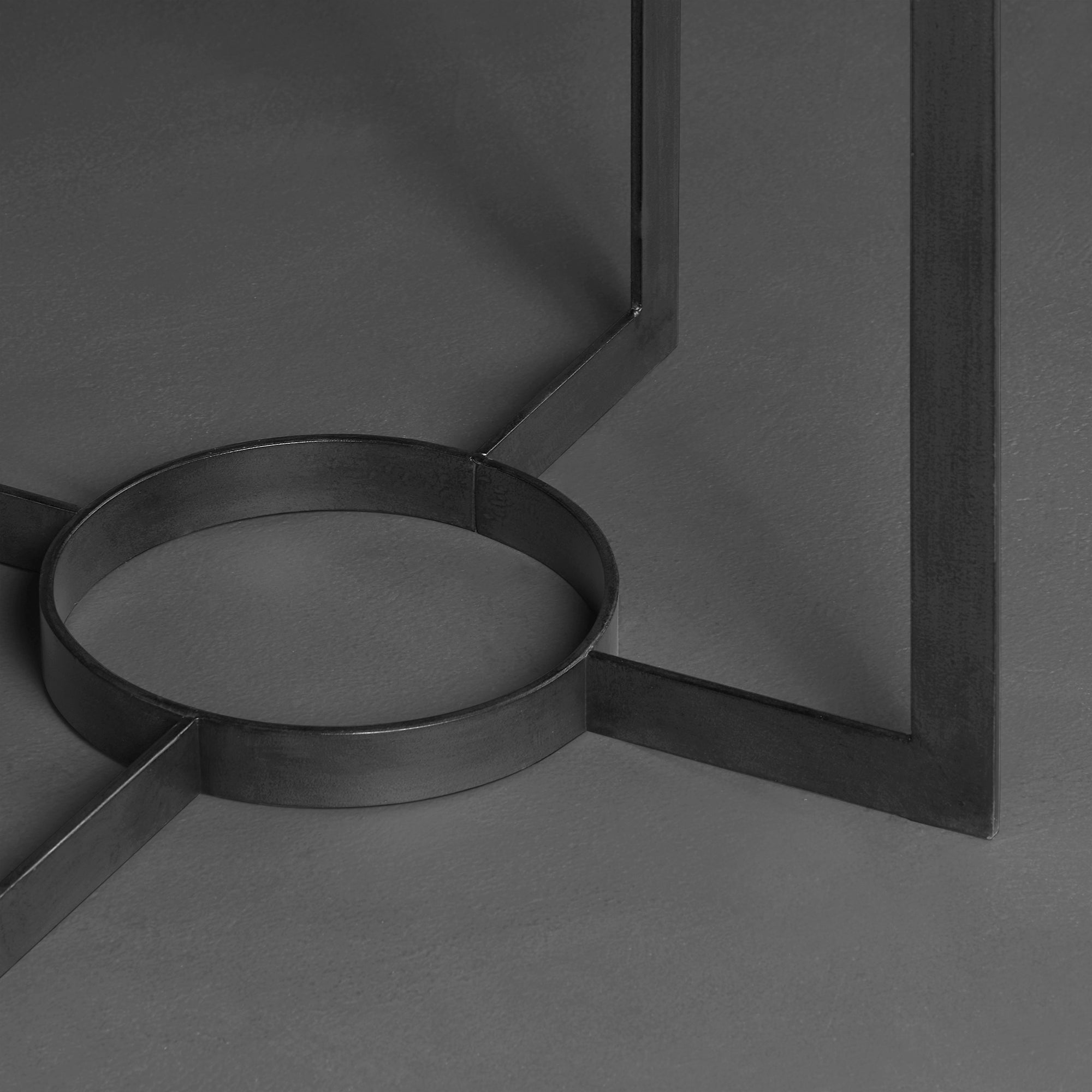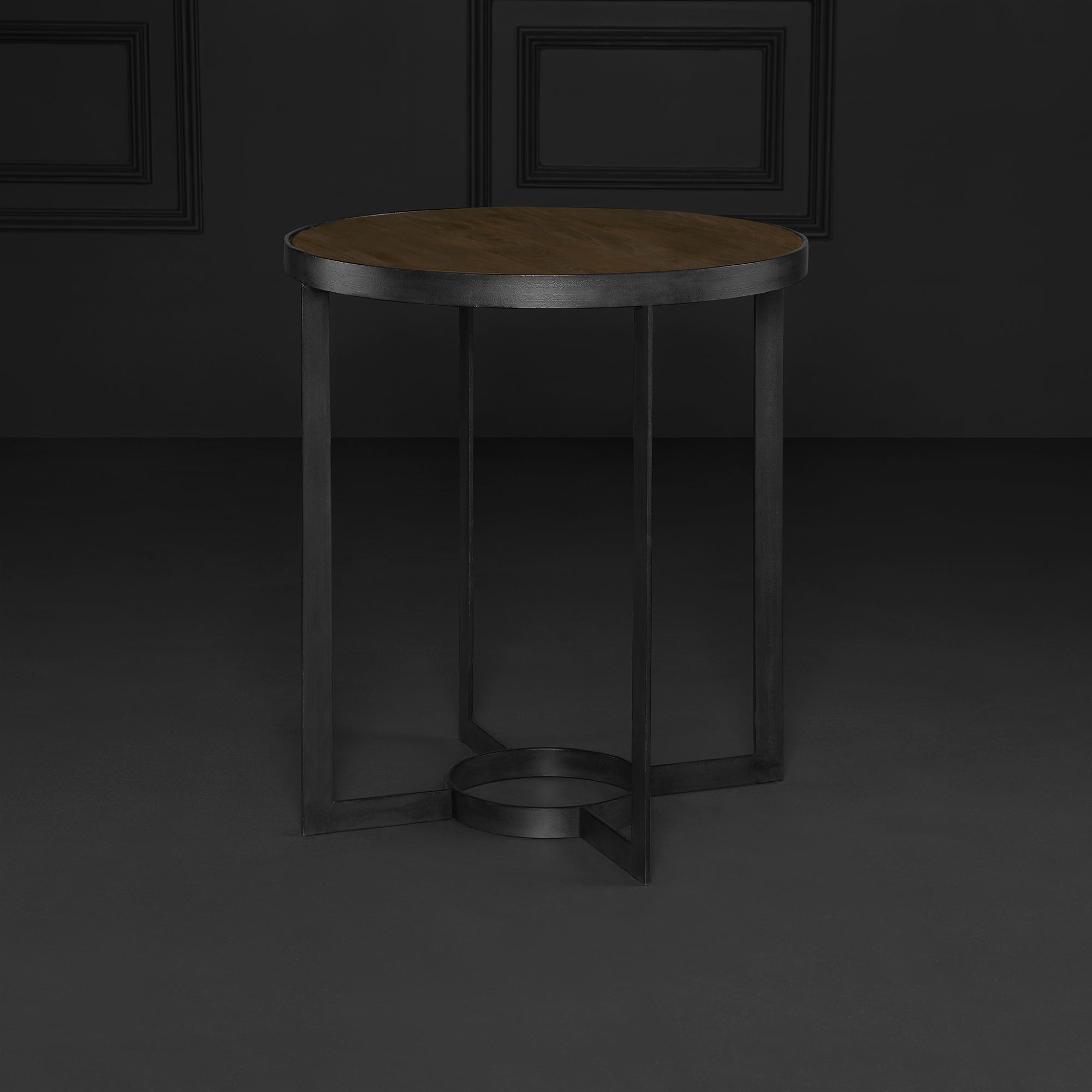 Moderna mesa lateral de cubierta redonda, estilizada por su alargada base de metal con un detalle circular en la parte inferior.