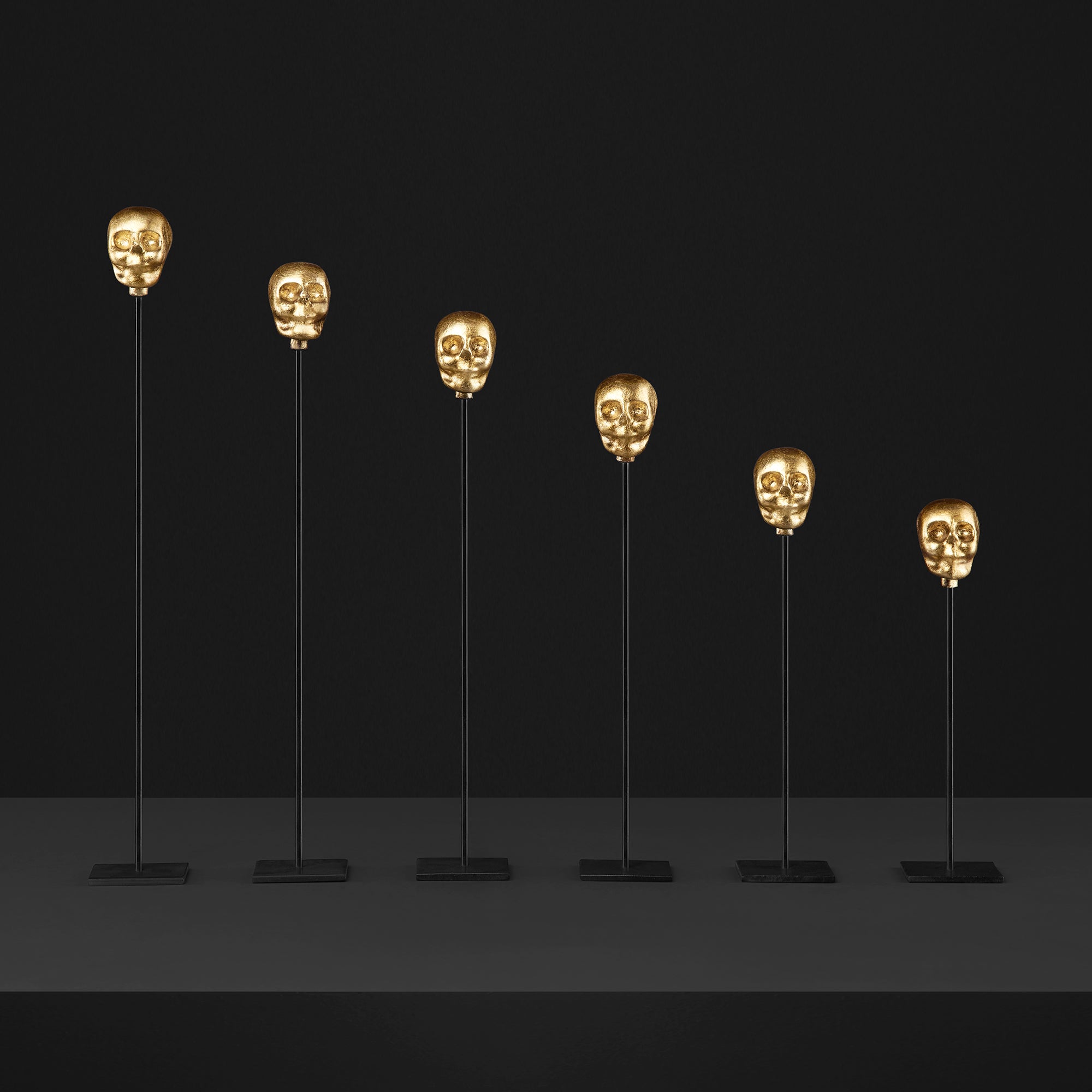 Dale un toque moderno y único a tu espacio con este set de cráneos que es ideal para complementar tu decoración, elaborado a partir de figuras de cráneo finamente moldeadas y cubiertas por una capa de hoja de oro laqueada, se encuentras postrados en una base metálica en tono negro, esta pieza hará de tu espacio algo único.