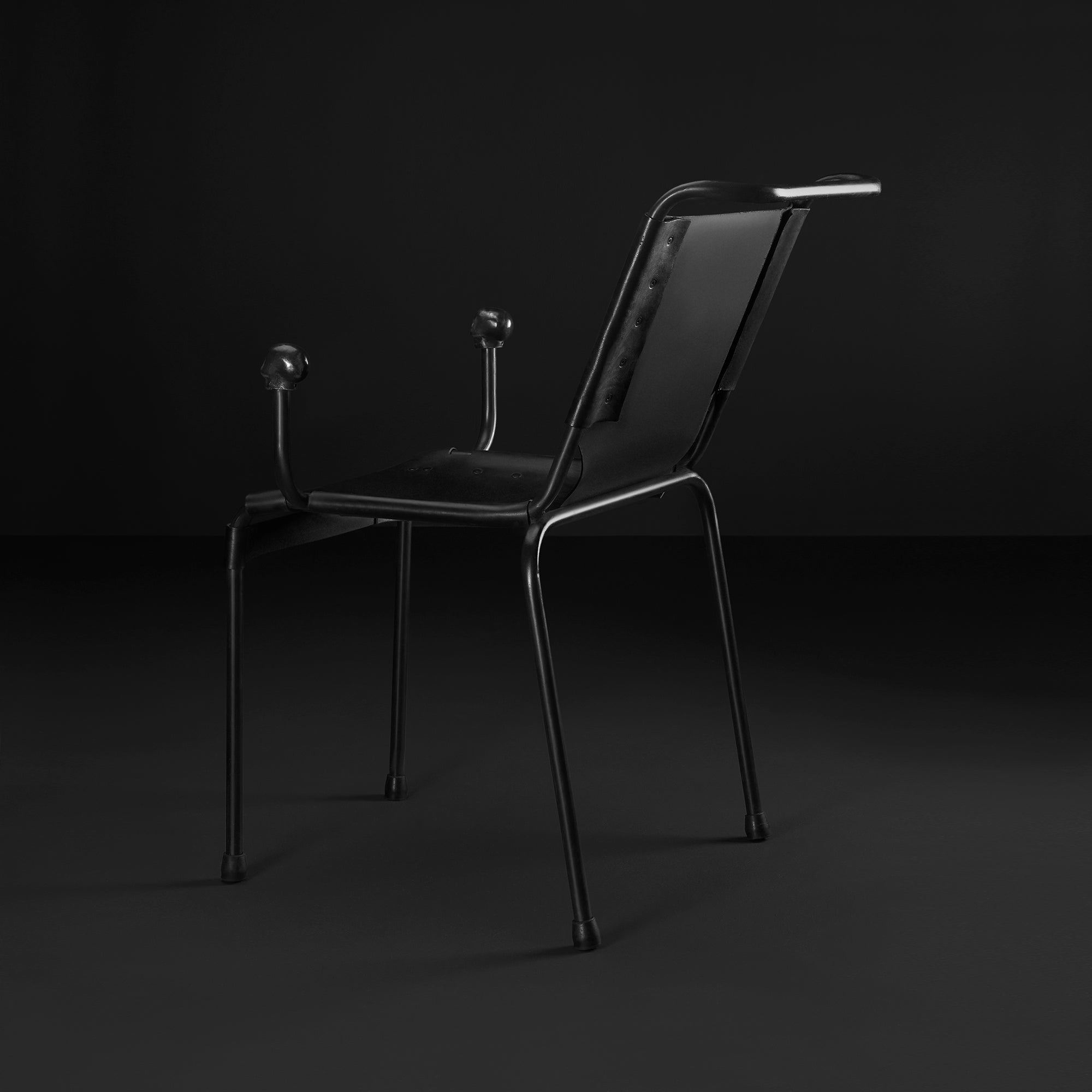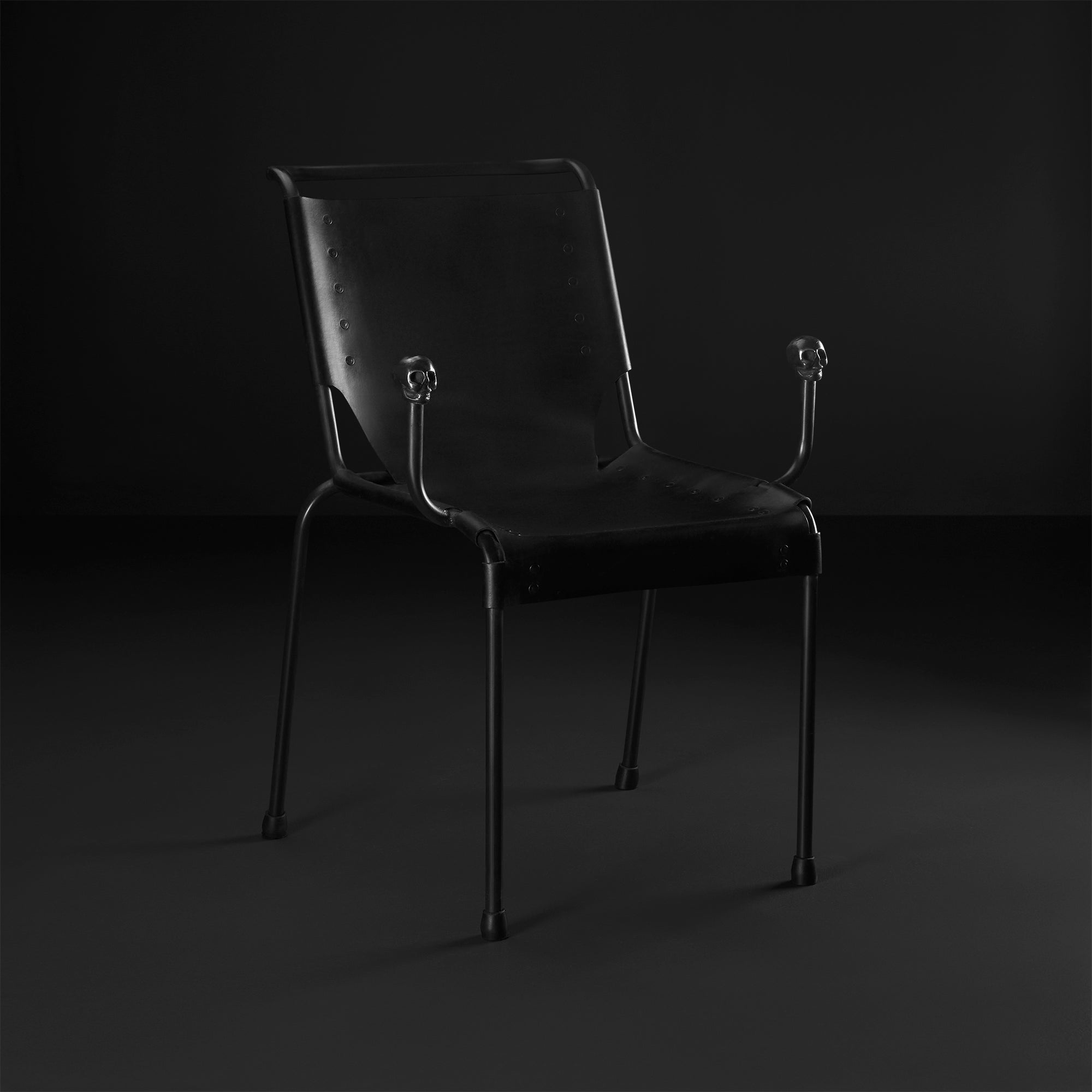 Vanguardista y cómoda silla de metal con detalles de cráneos en la punta de los brazos, sin descuidar el elegante acabado de piel aplicados tanto en respaldo como asiento. Acabado en aluminio viejo inglés y forro en piel negra.